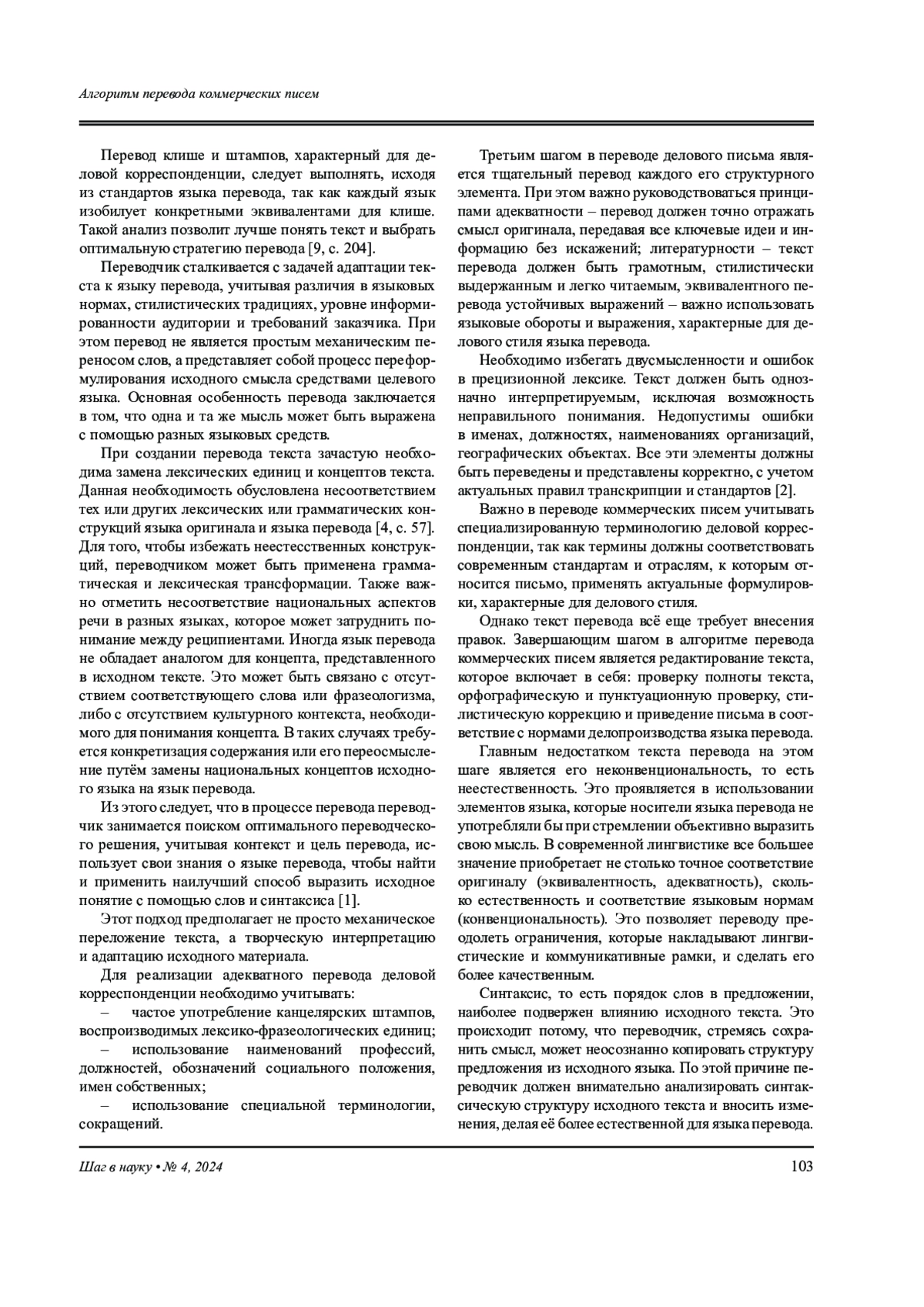 В работе были рассмотрены особенности и этапы написания коммерческих писем, а также представлены комплексный подход, включающий анализ коммуникативных целей, выбор правильного стиля, использование профессиональной терминологии, выбор конвенциональных переводческих трансформаций. Актуальность исследования определяется расширением деловых коммуникаций в эпоху развития торговых отношений между разными странами, поэтому проблема адекватного перевода в бизнес-коммуникациях требует уточнения. Целью исследования является изучение процесса написания коммерческих писем на предмете базового алгоритма написания коммерческих писем, обеспечивающего наилучшие результаты. Нами был применен анализ, синтез, описательный метод, серьезный анализ научной литературы. Было установлено, что перевод коммерческих писем требует не только языковой квалификации, но и глубокого понимания бизнес-контекста, этикета и культурной среды.