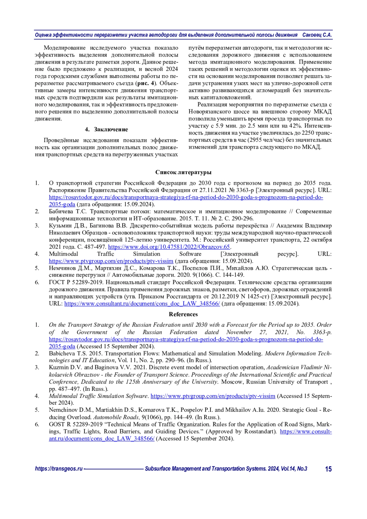 Одним из наиболее эффективных способов повышения пропускной способности участков улично-дорожной сети является организация дополнительных полос движения путём переразметки дороги без изменения её геометрических размеров. Однако реализация данного способа требует оценки влияния его результатов на остальные транспортные потоки на участке. Наиболее сложными объектами для выработки таких решений являются перекрёстки и транспортные развязки. В статье представлена методология оценки эффективности переразметки участка автодороги для выделения дополнительной полосы движения. Оценка выполнена с использованием метода имитационного моделирования и программного инструмента компании PTV Group. В качестве объекта исследования выбран съезд с Новорязанского шоссе на внешнюю сторону Московской кольцевой автодороги. Выбор объекта обусловлен возникновением на нём регулярных заторов в утренние «часы пик». Реализация предлагаемого мероприятия позволила уменьшить время проезда транспортных средств по участку с 5.9 мин. до 2.5 мин или на 42%. Интенсивность движения на участке увеличилась до 2250 транспортных средств в час (2955 чел/час) без значительных изменений для транспорта следующего по Московской кольцевой автодороге.