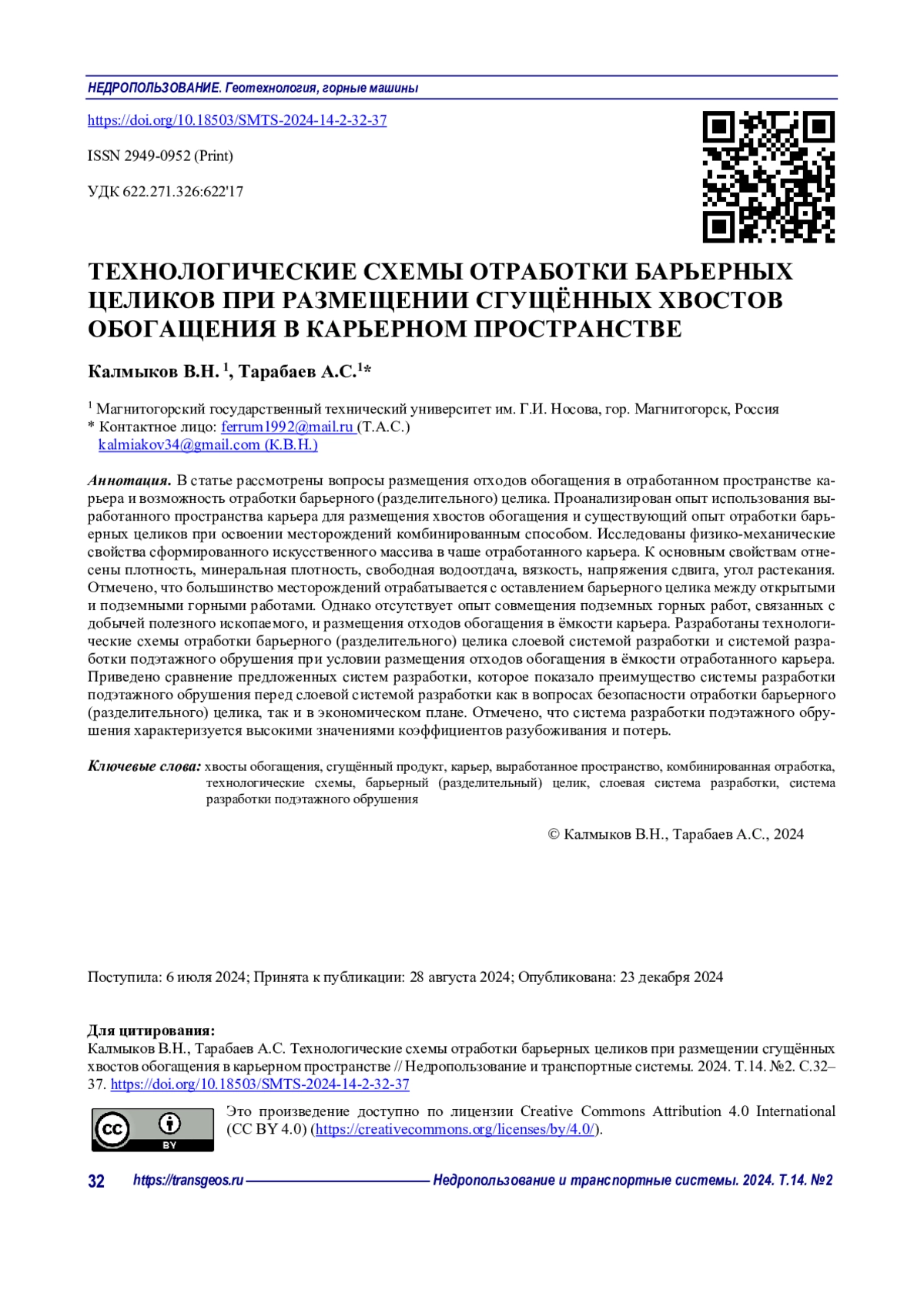 В статье рассмотрены вопросы размещения отходов обогащения в отработанном пространстве карьера и возможность отработки барьерного (разделительного) целика. Проанализирован опыт использования выработанного пространства карьера для размещения хвостов обогащения и существующий опыт отработки барьерных целиков при освоении месторождений комбинированным способом. Исследованы физико-механические свойства сформированного искусственного массива в чаше отработанного карьера. К основным свойствам отнесены плотность, минеральная плотность, свободная водоотдача, вязкость, напряжения сдвига, угол растекания. Отмечено, что большинство месторождений отрабатывается с оставлением барьерного целика между открытыми и подземными горными работами. Однако отсутствует опыт совмещения подземных горных работ, связанных с добычей полезного ископаемого, и размещения отходов обогащения в ёмкости карьера. Разработаны технологические схемы отработки барьерного (разделительного) целика слоевой системой разработки и системой разработки подэтажного обрушения при условии размещения отходов обогащения в ёмкости отработанного карьера. Приведено сравнение предложенных систем разработки, которое показало преимущество системы разработки подэтажного обрушения перед слоевой системой разработки как в вопросах безопасности отработки барьерного (разделительного) целика, так и в экономическом плане. Отмечено, что система разработки подэтажного обрушения характеризуется высокими значениями коэффициентов разубоживания и потерь.