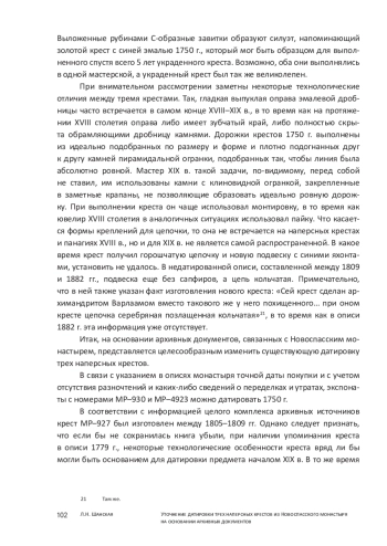 в 1919 г. из новоспасского монастыря в оружейную палату Московского Кремля поступили церковные ценности: напрестольные и наперсные кресты, литургические сосуды, облачения. помимо имущества, хранившегося в соборах монастыря и монастырской ризнице, в музее оказались документы – «описная книга новоспасского монастыря церковным и ризным вещам учиненная с 779 г.» и ее копия1, записи в которых можно соотнести с поступившими в том же году предметами. в Российском государственном архиве древних актов также сохранился довольно большой комплекс документов2, относящихся к новоспасскому монастырю, в том числе записные книги и ведомости церковной утвари, описи монастырского имущества. среди зафиксированных в описях вещей, среди сделанных по различным поводам и в силу различных обстоятельств записей в деловых бумагах достаточно легко опознаются памятники, хранящиеся ныне в собрании Музеев Московского Кремля. в данном исследовании стоит задача скорректировать датировку трех наперсных крестов, опираясь на информацию, содержащуюся в вышеназванных архивных источниках.