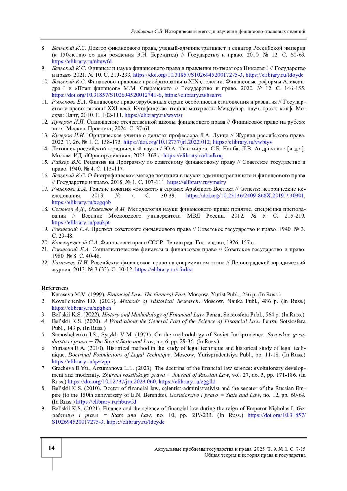 В работе исследуются не только особенности исторического метода исследования, но и его нюансы при проведении исследований в области финансового права. Представлены особенности указанной отрасли, влияющие на применение данного метода, выявлены труды ученых, подготовленные на основе данного метода, представлены высказывания исследователей, внесших весомый вклад в развитие финансового права в его переломные этапы. Рассматриваются различные точки зрения ученых, формировавшиеся под воздействием исторических, экономических, правовых, социальных, политических и иных условий. В рамках работы автор позиционирует в качестве объекта финансово-правового регулирования саму финансовую систему как цельное образование с функцией распределения народного дохода и формирования государственных финансов. В рамках выводов по исследованию установлено, что именно существенное изменение экономических отношений на рубежах XIX-XX и XX-XXI веков, связанное, прежде всего, с изменениями в процессах распределения и перераспределения финансовых и кредитных ресурсов в рамках финансово-кредитной системы государства, то есть непосредственно самого распределительного механизма, требует тщательного анализа и учета указанного фактора при рассмотрении вопросов, связанных с определением границ современного финансового права, сущность которого и направлена на правовое регулирование указанного механизма.