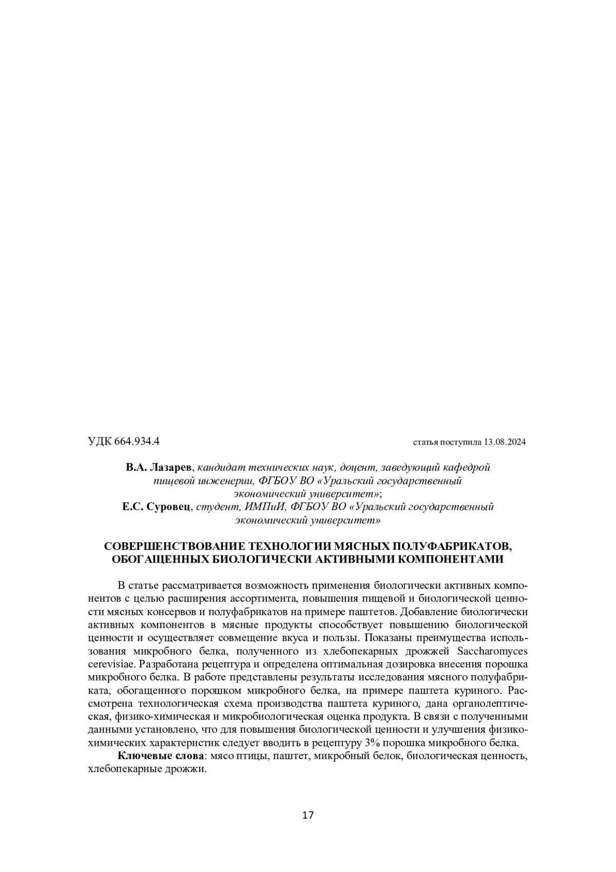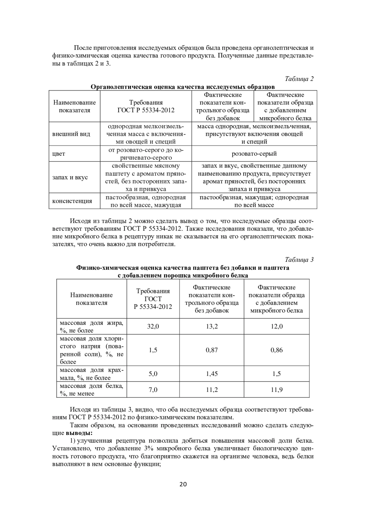 В статье рассматривается возможность применения биологически активных компонентов с целью расширения ассортимента, повышения пищевой и биологической ценности мясных консервов и полуфабрикатов на примере паштетов. Добавление биологически активных компонентов в мясные продукты способствует повышению биологической ценности и осуществляет совмещение вкуса и пользы. Показаны преимущества использования микробного белка, полученного из хлебопекарных дрожжей Saccharomyces cerevisiae. Разработана рецептура и определена оптимальная дозировка внесения порошка микробного белка. В работе представлены результаты исследования мясного полуфабриката, обогащенного порошком микробного белка, на примере паштета куриного. Рассмотрена технологическая схема производства паштета куриного, дана органолептическая, физико-химическая и микробиологическая оценка продукта. В связи с полученными данными установлено, что для повышения биологической ценности и улучшения физико-химических характеристик следует вводить в рецептуру 3% порошка микробного белка.