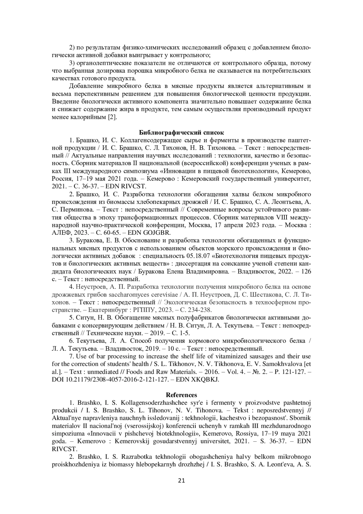 1. Брашко, И. С. Коллагенсодержащее сырье и ферменты в производстве паштетной продукции / И. С. Брашко, С. Л. Тихонов, Н. В. Тихонова. - Текст: непосредственный // Актуальные направления научных исследований: технологии, качество и безопасность. Сборник материалов II национальной (всероссийской) конференции ученых в рамках III международного симпозиума “Инновации в пищевой биотехнологии”, Кемерово, Россия, 17-19 мая 2021 года. - Кемерово: Кемеровский государственный университет, 2021. - С. 36-37. EDN: RIVCST