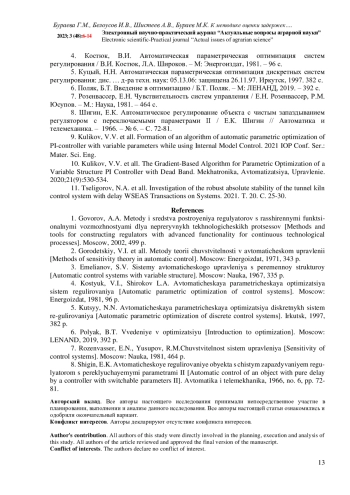 10. Kulikov, V.V. et all. The Gradient-Based Algorithm for Parametric Optimization of a Variable Structure PI Controller with Dead Band. Mekhatronika, Avtomatizatsiya, Upravlenie. 2020;21(9):530-534.