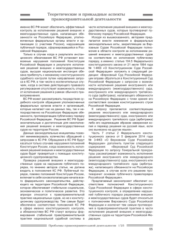 В статье рассматриваются вопросы, касающиеся совершенствования правового механизма защиты основ конституционного строя Российской Федерации от исполнения решений иностранного или международного суда, иностранного или международного третейского суда (арбитража), налагающих обязанности на Российскую Федерацию, которые противоречат действующему публичному порядку. Авторы статьи обращают внимание на то, что такие конституционно-правовые категории как «публичный порядок» и «нарушение публичного порядка» законодателем официально не определены и формируются на основании правоприменительной практики национальных судов, рассматривающих вопросы возможности исполнения на территории Российской Федерации решений внешних судов. Между тем на законодательном уровне в качестве уполномоченного лица, осуществляющего контроль за исполнением решений межгосударственных и иностранных судов, налагающих обязанности на Российскую Федерацию, которые противоречат публичному порядку, с 2021 года определена Генеральная прокуратура Российской Федерации, чьи полномочия пересекаются со сформировавшейся правоприменительной практикой национальных судов. В связи с чем авторами статьи разработаны предложения по совершенствованию действующего законодательства, регулирующего вопросы исполнения решений внешних судов, где в качестве основного элемента контроля за пресечением нарушения публичного порядка выступает Верховный Суд Российской Федерации.