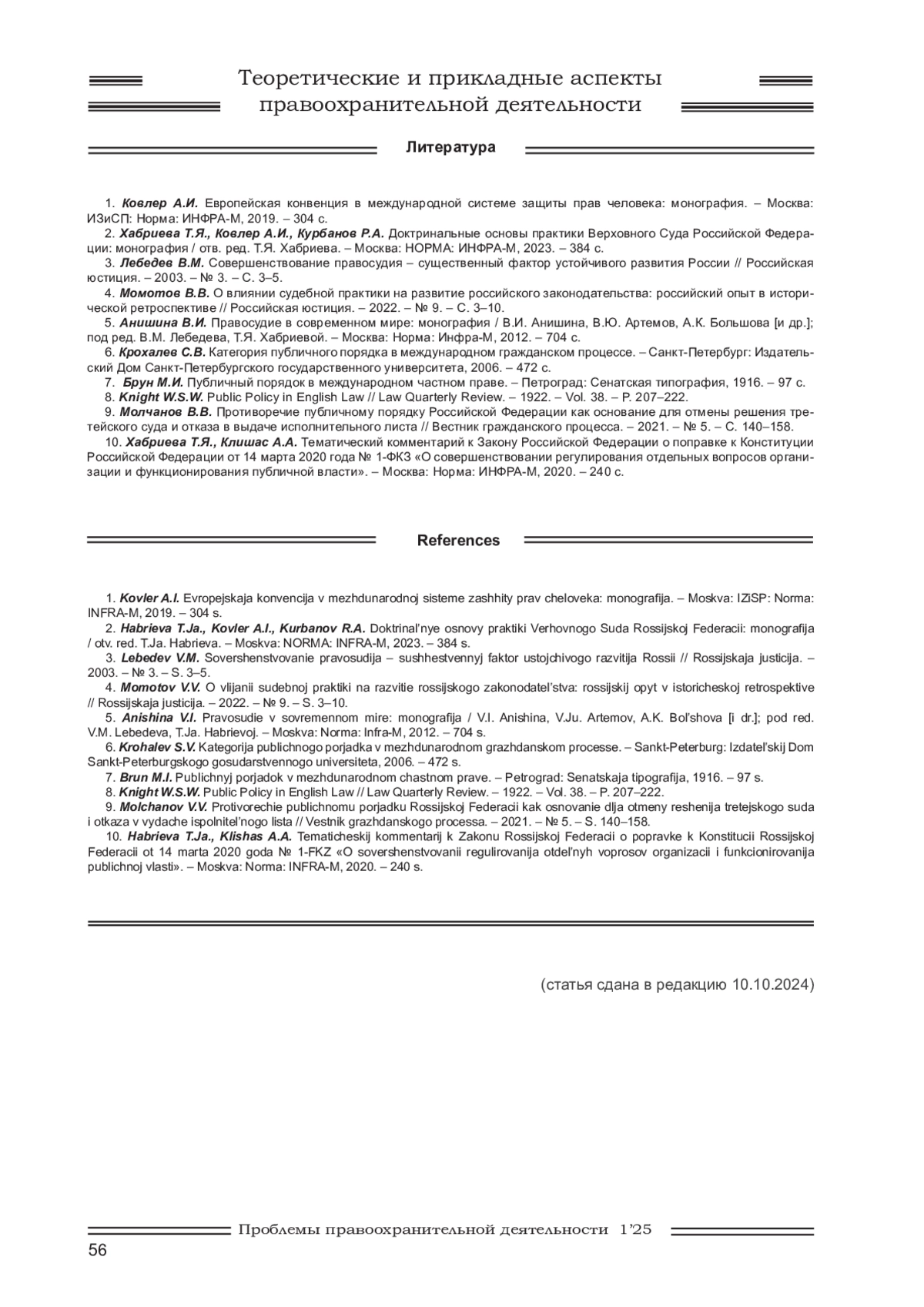 2. Хабриева Т.Я., Ковлер А.И., Курбанов Р.А. Доктринальные основы практики Верховного Суда Российской Федерации: монография / отв. ред. Т.Я. Хабриева. - Москва: НОРМА: ИНФРА-М, 2023. - 384 с. EDN: DLWAMW