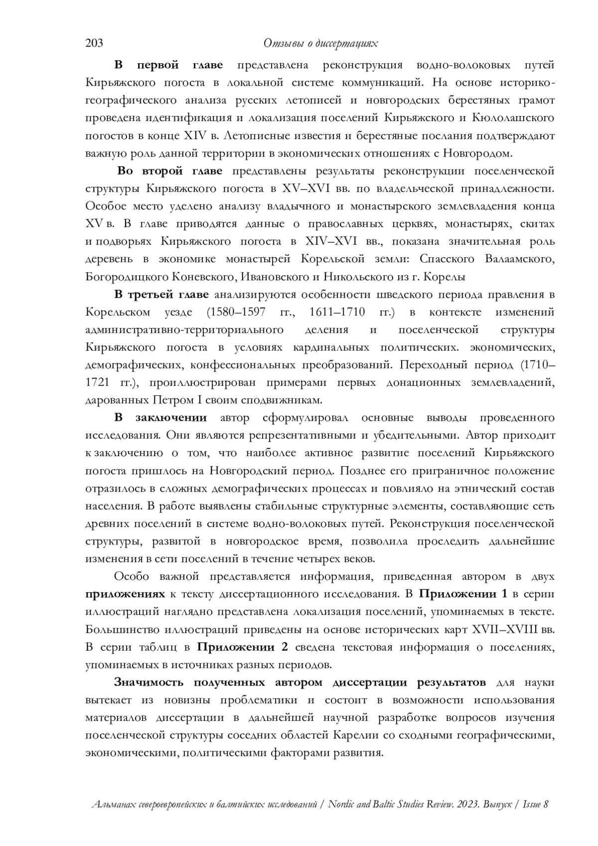 Тема диссертационного исследования М. И. Петровой представляется несомненно значимой для отечественной исторической науки, поскольку изучение истории регионов Российской Федерации является одной из ее важнейших задач. Выбор Кирьяжского (Куркиёкского) погоста в качестве региона исследования не случаен.