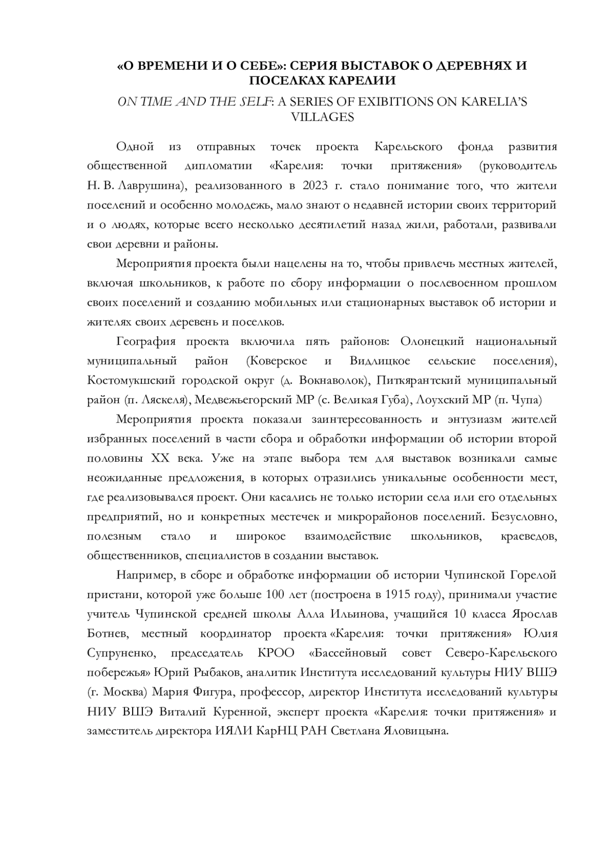 Одной из отправных точек проекта Карельского фонда развития общественной дипломатии «Карелия: точки притяжения» (руководитель Н. В. Лаврушина), реализованного в 2023 г. стало понимание того, что жители поселений и особенно молодежь, мало знают о недавней истории своих территорий и о людях, которые всего несколько десятилетий назад жили, работали, развивали свои деревни и районы.