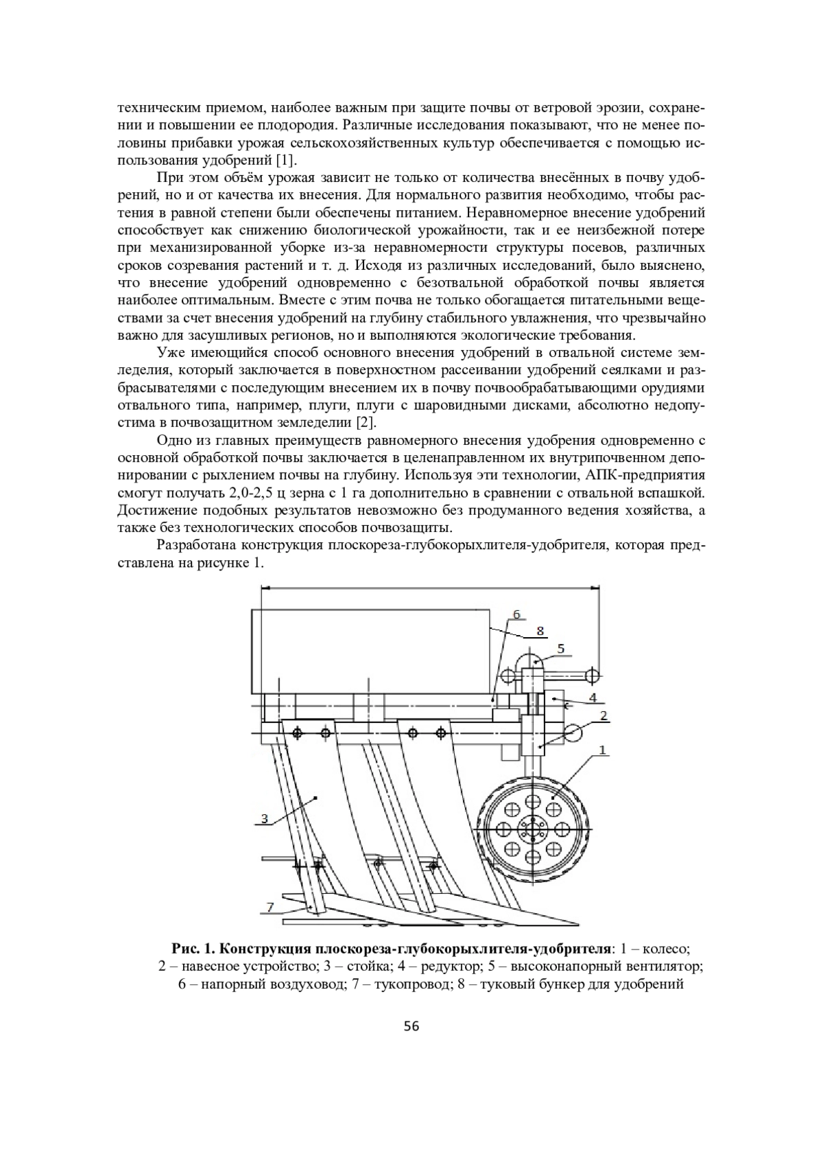 Высокая урожайность в большей степени зависит от правильного, равномерного внесения удобрений. Неравномерное внесение удобрений может привести как к снижению биологической урожайности из-за избытка удобрительной смеси в одном месте и нехватки удобрительной в другом, так и к неизбежным потерям при механизированной уборке из-за неравномерной структуры посевов и разных сроков созревания растений. В данной статье разработана конструкция плоскореза-глубокорыхлителя-удобрителя, позволяющая повысить качество обработки почвы и посевов, а также эффективность внутрипочвенного равномерного внесения удобрений.