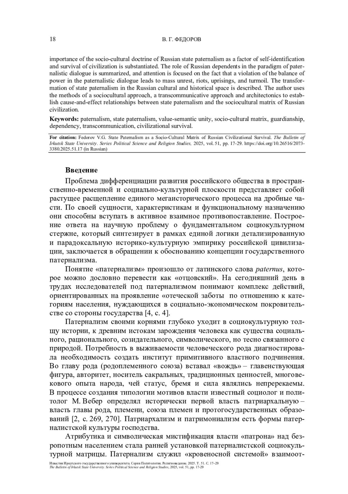 Поднимается проблема изучения государственного патернализма как социокультурного стержня российского общества. Проведен подробный анализ государственного патернализма в качестве социокультурной матрицы российской цивилизации. Рассматривается вопрос о сохранении комплексного ценностно-смыслового единства российского общества в рамках перманентных исторических потрясений и кризисов. Обосновывается значимость социокультурной доктрины российского государственного патернализма как фактора самоидентификации и выживаемости цивилизации. Резюмируется роль российских приживальцев (иждивенцев) в парадигме патерналистского диалога, акцентируется внимание, что нарушение баланса сил в патерналистском диалоге приводит к массовым волнениям, бунтам, восстаниям, смуте. Описывается трансформация государственного патернализма в российском культурно-историческом пространстве. Используются методы социокультурного подхода, транскоммуникативного подхода и архитектоники для установления причинно-следственных связей между государственным патернализмом и социокультурной матрицей российской цивилизации.