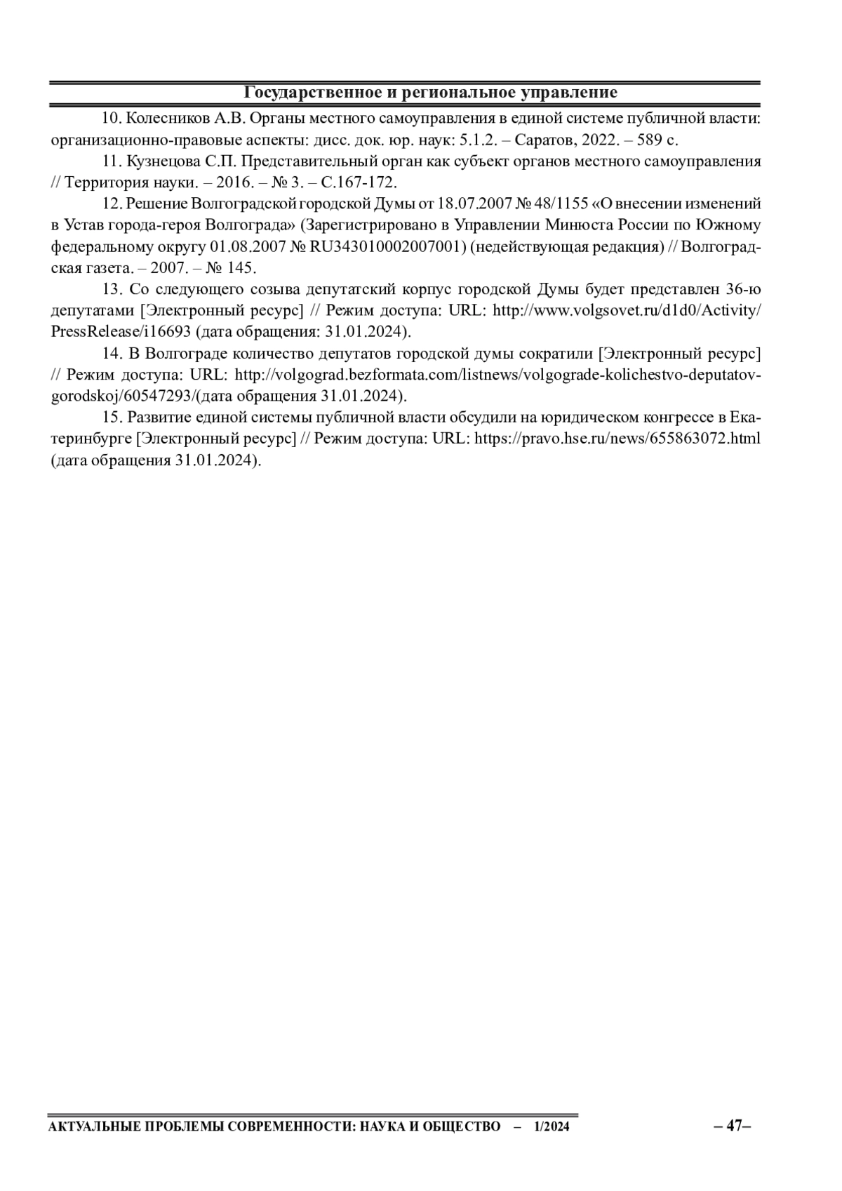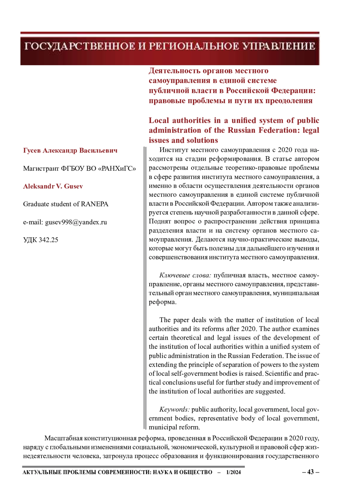 ГУСЕВ А. В. ДЕЯТЕЛЬНОСТЬ ОРГАНОВ МЕСТНОГО САМОУПРАВЛЕНИЯ В ЕДИНОЙ СИСТЕМЕ ПУБЛИЧНОЙ ВЛАСТИ В РОССИЙСКОЙ ФЕДЕРАЦИИ: ПРАВОВЫЕ ПРОБЛЕМЫ И ПУТИ ИХ ПРЕОДОЛЕНИЯ // АКТУАЛЬНЫЕ ПРОБЛЕМЫ СОВРЕМЕННОСТИ: НАУКА И ОБЩЕСТВО. 2024. № 1 (39)