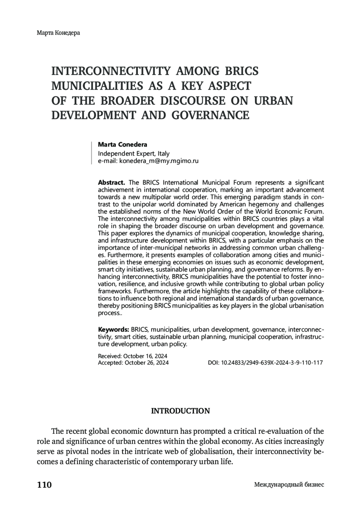 Международный муниципальный форум БРИКС представляет собой значительное достижение в сфере международного сотрудничества и знаменует важный этап на пути к новому многополярному мировому порядку. Эта новая парадигма возникла как ответ на однополярный мир, в котором доминируют США, и ставит под сомнение мировой порядок, установленный в рамках Всемирного экономического форума. Сотрудничество между муниципалитетами стран БРИКС формирует площадку для обсуждения вопросов городского развития и управления. В данной статье рассматриваются динамика муниципального сотрудничества, обмен знаниями и развитие инфраструктуры в рамках БРИКС, с особым акцентом на значимость межмуниципального взаимодействия для решения городских проблем. Вместе с тем приводятся примеры того, как города и муниципалитеты в развивающихся экономиках сотрудничают по вопросам экономического развития, инициатив «умных городов», устойчивого городского планирования и реформ управления. Благодаря укреплению сотрудничества муниципалитеты БРИКС повышают свой потенциал в сфере инновационной деятельности, устойчивости и инклюзивного роста, одновременно внося вклад в глобальные вопросы городского планирования. Кроме того, в статье рассматривается способность муниципалитетов стран БРИКС оказывать влияние как на региональные, так и на международные стандарты городского управления, что позиционирует их в качестве ключевых участников процесса глобальной урбанизации.