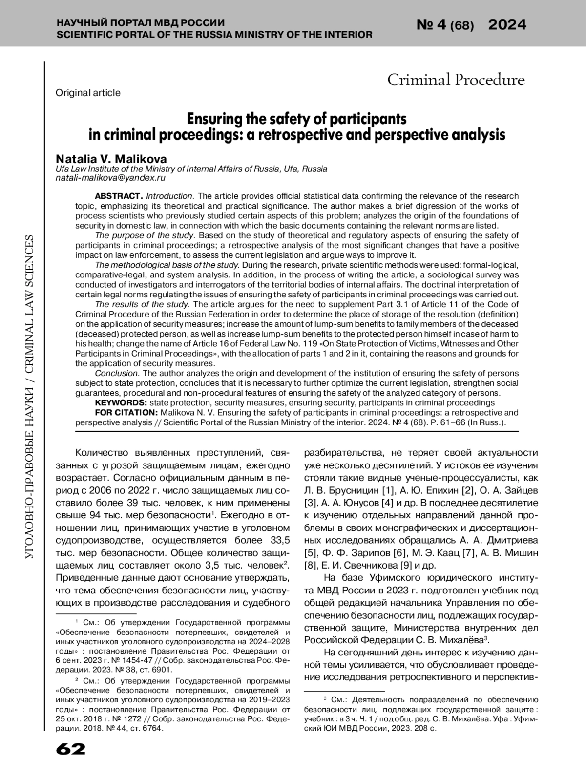 Методологическая основа исследования. При проведении исследования применялись частнонаучные методы: формально-логический, сравнительно-правовой, системного анализа. Кроме того, в процессе написания статьи проводился социологический опрос следователей и дознавателей территориальных органов внутренних дел. Осуществлялось доктринальное толкование отдельных правовых норм, регулирующих вопросы обеспечения безопасности участников уголовного судопроизводства.