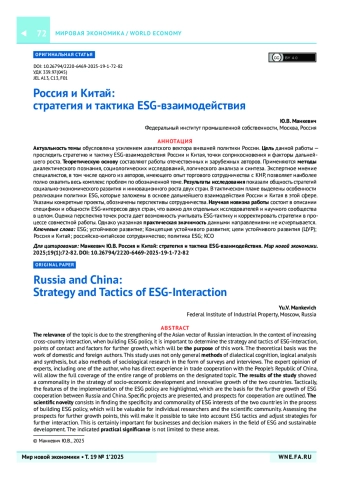 МАНКЕВИЧ Ю. В. РОССИЯ И КИТАЙ: СТРАТЕГИЯ И ТАКТИКА ESG-ВЗАИМОДЕЙСТВИЯ // МИР НОВОЙ ЭКОНОМИКИ. 2025. ТОМ 19, №1