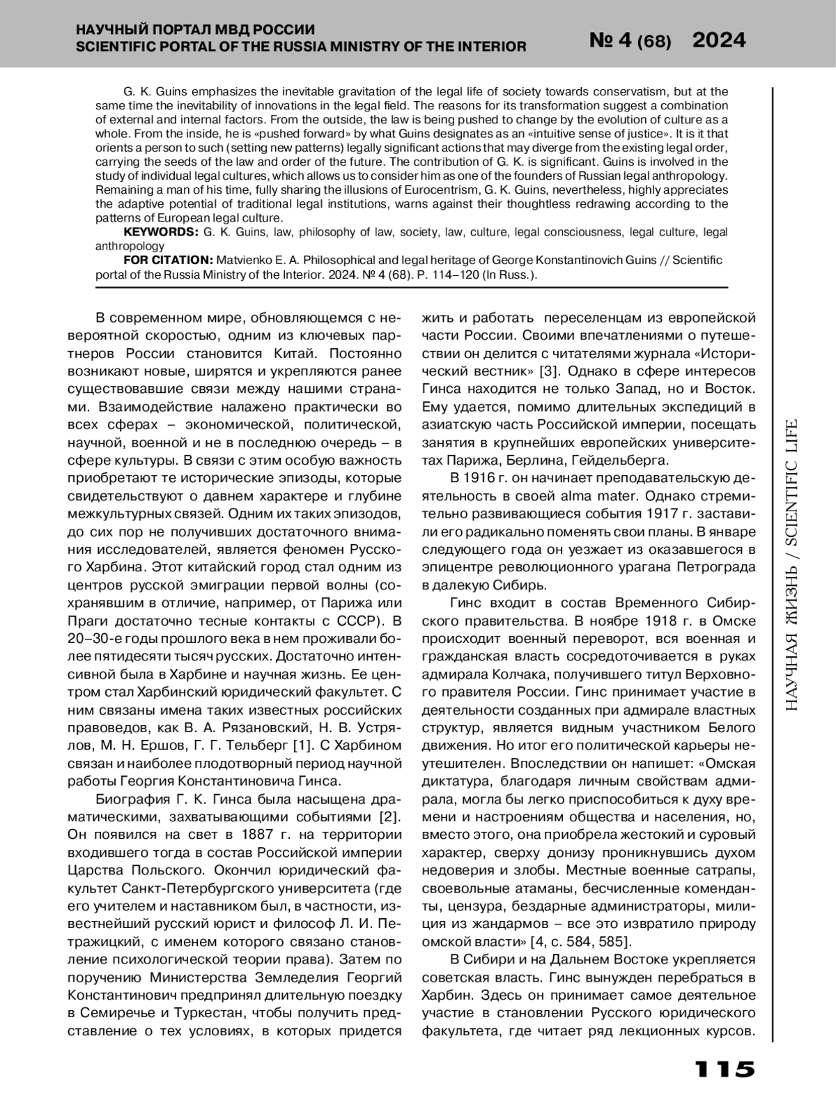 Посвящена рассмотрению политических и правовых взглядов яркого представителя русской эмиграции первой волны Георгия Константиновича Гинса. Его работы, опубликованные еще в 20-30-х годых ХХ века, сохраняют значительную актуальность. Биография Г. К. Гинса была богата событиями, однако на всех ее этапах он уделял большое внимание науке, прежде всего - философии права. В центре его концепции - проблема взаимодействия права, с одной стороны, и широко понимаемой культуры общества - с другой. Он указывает, что право всегда является продуктом определенной культуры, вытекает из социальной природы человека. Однако механизмы культурной детерминации права с ходом исторического развития меняются. Процесс правотворчества постепенно приобретает все более сознательный характер. Возникновение права трактуется Г. К. Гинсом как процесс адаптации индивидов и коллективов к необходимости совместного существования в уникальных природных и социальных условиях.