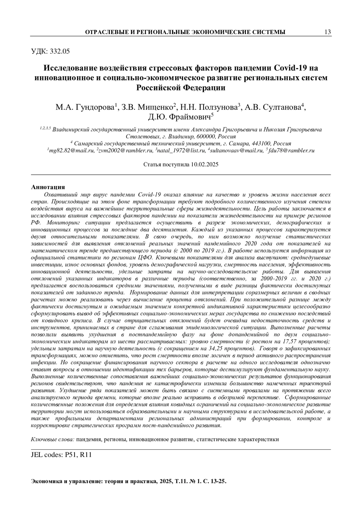 Охвативший мир вирус пандемии Covid-19 оказал влияние на качество и уровень жизни населения всех стран. Происходящие на этом фоне трансформации требуют подробного количественного изучения степени воздействия вируса на важнейшие территориальные сферы жизнедеятельности. Цель работы заключается в исследовании влияния стрессовых факторов пандемии на показатели жизнедеятельности на примере регионов РФ. Мониторинг ситуации предлагается осуществить в разрезе экономических, демографических и инновационных процессов за последние два десятилетия. Каждый из указанных процессов характеризуется двумя относительными показателями. В свою очередь, по ним возможно получение статистических зависимостей для выявления отклонений реальных значений пандемийного 2020 года от показателей на математическом тренде предшествующего периода (с 2000 по 2019 гг.). В работе используется информация из официальной статистики по регионам ЦФО. Ключевыми показателями для анализа выступают: среднедушевые инвестиции, износ основных фондов, уровень демографической нагрузки, смертность населения, эффективность инновационной деятельности, удельные затраты на научно-исследовательские работы. Для выявления отклонений указанных индикаторов в различные периоды (соответственно, за 2000-2019 гг. и 2020 г.) предлагается воспользоваться средними значениями, полученными в виде разницы фактически достигнутых показателей от заданного тренда. Нормирование данных для интерпретации соразмерных величин в сводных расчетах можно реализовать через вычисление процента отклонений. При положительной разнице между фактически достигнутым и ожидаемым значением конкретной индикативной характеристики целесообразно сформулировать вывод об эффективных социально-экономических мерах государства по снижению последствий от ковидного кризиса. В случае отрицательных отклонений будет очевидна недостаточность средств и инструментов, принимаемых в стране для сглаживания эпидемиологической ситуации. Выполненные расчеты позволили выявить ухудшения в постпандемийную фазу на фоне допандемийной по двум социально-экономическим индикаторам из шести рассматриваемых: уровню смертности (с ростом на 17,57 процентов); удельным затратам на научную деятельность (с сокращением на 34,25 процентов). Говоря о зафиксированных трансформациях, можно отметить, что рост смертности вполне логичен в период активного распространения инфекции. Но сокращение финансирования научного сектора в расчете на одного исследователя однозначно ставит вопросы в отношении идентификации тех барьеров, которые дестимулируют фундаментальную науку. Выполненные количественные сопоставления важнейших социально-экономических результатов функционирования регионов свидетельствуют, что пандемия не катастрофически изменила большинство намеченных траекторий развития. Ухудшение ряда показателей может быть связано с системными провалами на протяжении всего анализируемого периода времени, которые вполне реально исправить в обозримой перспективе. Сформированные количественные положения для определения влияния ковидных ограничений на социально-экономическое развитие территории могут использоваться образовательными и научными структурами в исследовательской работе, а также профильными департаментами рег