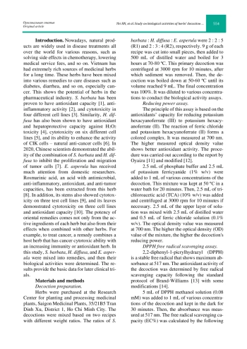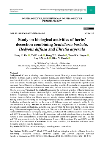 Справочная информация: рак является основной причиной смертности во всём мире. В настоящее время рак часто лечат с помощью различных методов, таких как хирургическое вмешательство, лучевая терапия и химиотерапия. Однако эти методы имеют множество побочных эффектов для пациентов, поэтому их часто сочетают с натуральными продуктами, чтобы уменьшить эти побочные эффекты. Согласно восточной медицине, существует множество народных средств для лечения рака. Для каждого типа рака есть соответствующие средства. В частности, для лечения рака печени использовались такие лекарственные травы, как шлемник обыкновенный, копеечник крупноцветковый, эреция шероховатая. Цель исследования: определить биологическую активность отваров из шлемника обыкновенного, копеечника крупноцветкового и эреции шероховатой, которые были протестированы в двух разных соотношениях (обозначены как R1 и R2). Материалы и методы: смешивание Scutellaria barbata, Hedyotis diffusa и Ehretia asperula в сухие смеси, а затем приготовление отвара. Тестирование антиоксидантной активности с помощью анализа восстановительной способности и анализа на поглощение свободных радикалов DPPH. Оценка антибактериальной активности с помощью анализа на диффузию в агаре и цитотоксической способности с помощью анализа с использованием сульфородамина B. Результаты: отвар R1, в котором было больше E. asperula, показал большую антиоксидантную, антибактериальную и цитотоксическую активность, чем отвар R2. При определении восстановительной способности оптическая плотность отвара R1 составила 2,80, а другого — 2,23 при концентрации 0,7%. В тесте на поглощение свободных радикалов DPPH значения EC50 для отваров R1 и R2 составили 0,022% и 0,035% соответственно. Оба отвара R1 и R2 обладали противомикробной активностью в отношении Bacillus subtilis при 100%-ной концентрации, о чём свидетельствуют диаметры зон ингибирования роста 11,33 мм и 7,40 мм соответственно. В тесте с сульфородамином B IC50 отвара R1 составил 0,47%, а IC50 отвара R2 — 0,66%. Вывод: в одинаковых условиях отвар R1 показал более высокую биологическую активность, чем отвар R2.