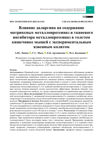 Актуальность: Язвенный колит – хроническое, мультифакториальное заболевание, развитие которого определяется нарушениями микробиоты толстого кишечника, неправильным питанием, неадекватным иммунным ответом на патогенную и комменсальную микрофлору на фоне генетической предрасположенности, имеющее важное социальное значение. Показано повышение содержания матриксных металлопротеиназ в плазме и ткани ободочной кишки при язвенном колите. Важное значение в развитии воспаления в толстом кишечнике имеют матриксные металлопротеиназы-2, 9 и тканевой ингибитор металлопротеиназ-2. Существующие методы лечения язвенного колита недостаточно эффективны. Даларгин обладает уникальной совокупностью свойств, что делает перспективным его применение при лечении язвенного колита. Цель исследования: Изучение влияния даларгина на концентрацию матриксной металлопротеиназы-2, матриксной металлопротеиназы-9 и тканевого ингибитора металлопротеиназ-2 в медиальном отделе ободочной кишки мышей с экспериментальным язвенным колитом. Материалы и методы: Язвенный колит у мышей Balb/C моделировали заменой питьевой воды 5% раствором декстрана сульфата натрия в кипяченой воде на 5 суток. На 5, 7 и 28 сутки эксперимента в гомогенате медиального отдела ободочной кишки определяли содержание матриксных металлопротеиназ-2 и 9, тканевого ингибитора металлопротеиназ-2. Даларгин вводили подкожно в дозе 100 мкг/кг в течение 7 суток. Результаты: Установлено повышение содержания матриксных металлопротеиназ-2 и 9, а также тканевого ингибитора металлопротеиназ-2 в стенке толстого кишечника мышей с язвенным колитом на 5 и 7 сутки эксперимента. При хроническом язвенном колите только концентрация тканевого ингибитора металлопротеиназ-2 была достоверно выше, чем у интактных мышей. Применение даларгина приводило к снижению концентрации матриксных металлопротеиназ-2 и 9, тканевого ингибитора металлопротеиназ-2 в острый период болезни. При хроническом язвенном колите введение даларгина уменьшало концентрацию тканевого ингибитора металлопротеиназ-2 в стенке медиального отдела ободочной кишки. Заключение: Даларгин снижал содержание матриксных металлопротеиназ-2 и 9, тканевого ингибитора металлопротеиназ-2 в стенке толстого кишечника мышей с язвенным колитом на 5 и 7 сутки эксперимента. Указанный эффект был выше, чем у сульфасалазина, широко применяемого при лечении язвенного колита.