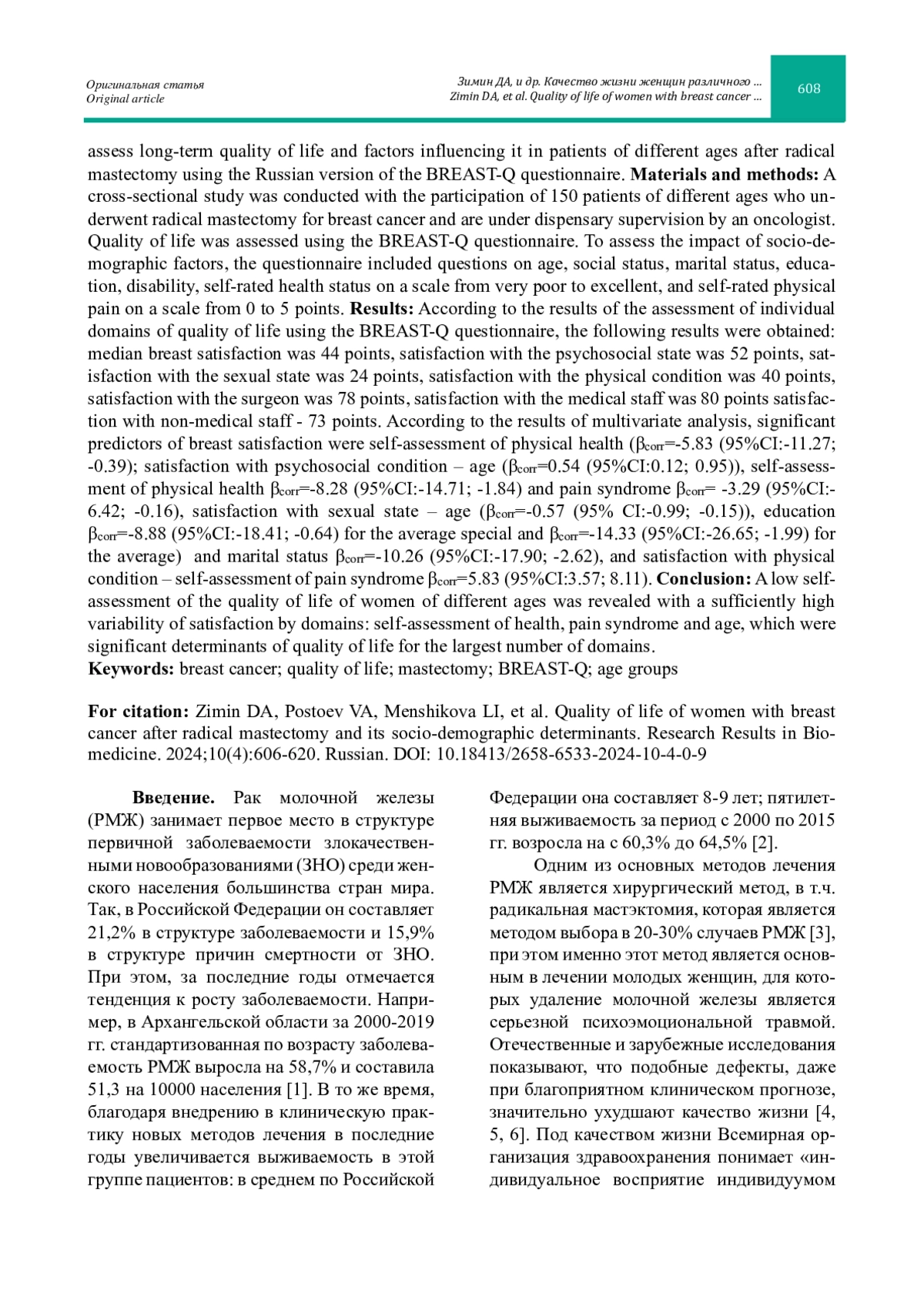 Актуальность: Рак молочной железы является наиболее частым злокачественным новообразованием среди женщин. Одним из основных методов лечения рака молочной железы является хирургический метод, в т. ч. радикальная мастэктомия, что наряду с повышением выживаемости может приводить к значимому снижению качества жизни. Цель исследования: Оценить качество жизни и факторы, на него влияющие, у пациенток различного возраста после радикальной мастэктомии в отдаленном периоде с использованием русскоязычной версии опросника BREAST-Q. Материалы и методы: Проведено поперечное исследование с участием 150 пациентов различного возраста, перенесших радикальную мастэктомию по поводу рака молочной железы и находящихся на диспансерном наблюдении у онколога. Оценка качества жизни проведена с использованием опросника BREAST-Q. Для оценки влияния социальнодемографических факторов в анкету были включены вопросы о возрасте, социальном статусе, семейном положении, образовании, наличие инвалидности, самооценке состояния здоровья по шкале от очень плохого до отличного и самооценке физической боли по шкале от 0 до 5 баллов. Результаты: По результатам оценки отдельных доменов качества жизни по опроснику BREAST-Q были получены следующие результаты: медиана удовлетворенности состоянием груди составила 44 балла, удовлетворенность психосоциальным состоянием - 52 балла, удовлетворенность сексуальным состоянием - 24 балла, удовлетворенность физическим состоянием - 40 баллов, удовлетворенность хирургом - 78 баллов, удовлетворенность медицинским персоналом - 80 баллов, удовлетворенность немедицинским персоналом - 73 балла. По результатам многофакторного анализа значимыми предикторами удовлетворенности состоянием груди являлась самооценка состояния физического здоровья (βкорр=-5,83 (95%ДИ:-11,27; -0,39); удовлетворенности психосоциальным состоянием – возраст (βкорр=0,54 (95%ДИ:0,12; 0,95)), самооценка физического здоровья βкорр=-8,28 (95%ДИ:-14,71; -1,84) и болевого синдрома βкорр=-3,29 (95%ДИ:-6,42; -0,16), удовлетворенности сексуальным состоянием - возраст (βкорр=-0,57 (95%ДИ:-0,99; -0,15)), образование βкорр=-8,88 (95%ДИ:-18,41; -0,64) для среднего специального и βкорр=-14,33 (95%ДИ:-26,65; -1,99) для среднего) и семейное положение βкорр=-10,26 (95%ДИ:-17,90; -2,62), а удовлетворенности физическим состоянием – самооценка болевого синдрома βкорр=5,83 (95%ДИ:3,57; 8,11). Заключение: Выявлена низкая самооценка качества жизни женщин различного возраста c достаточной высокой вариабельностью удовлетворенности по доменам: самооценка здоровья, болевого синдрома и возраст, которые явились значимыми детерминантами качества жизни по наибольшему числу доменов.