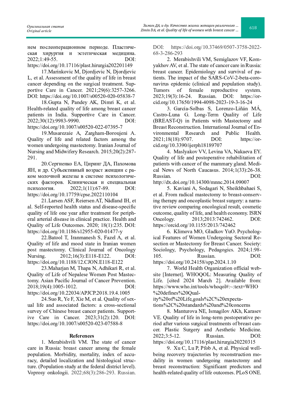 8. Мантурова НЕ, Исмагилов АХ, Карасев ВЕ. Качество жизни пациенток в позднем послеоперационном периоде различных вариантов хирургического лечения рака молочной железы. Пластическая хирургия и эстетическая медицина. 2022;3:5-12. DOI: https://doi.org/10.17116/plast.hirurgia20220315