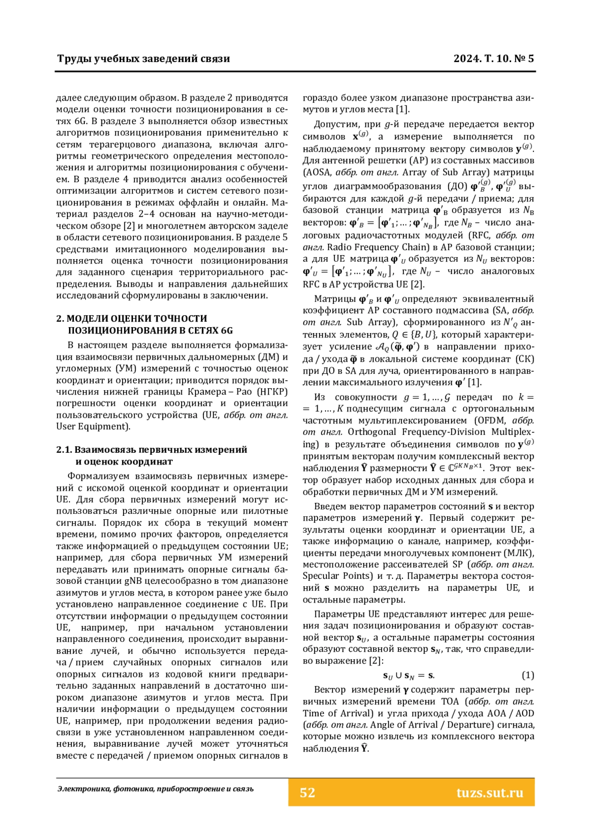 ВВЕДЕНИЕ Настоящая работа продолжает цикл [1], посвященный исследованию комплекса моделей позиционирования устройств в сетях шестого поколения терагерцового диапазона. Условия работы технологий позиционирования устройств в сетях шестого поколения имеют географическую протяженность в единицы-десятки метров и ограничены, преимущественно, сценариями внутри помещений. Материал исследования организован далее следующим образом. В разделе 2 приводятся модели оценки точности позиционирования в сетях 6G. В разделе 3 выполняется обзор известных алгоритмов позиционирования применительно к сетям терагерцового диапазона, включая алгоритмы геометрического определения местоположения и алгоритмы позиционирования с обучением. В разделе 4 приводится анализ особенностей оптимизации алгоритмов и систем сетевого позиционирования в режимах оффлайн и онлайн. Материал разделов 2–4 основан на научно-методическом обзоре [2] и многолетнем авторском заделе в области сетевого позиционирования. В разделе 5 средствами имитационного моделирования выполняется оценка точности позиционирования для заданного сценария территориального распределения. Выводы и направления дальнейших исследований сформулированы в заключении.