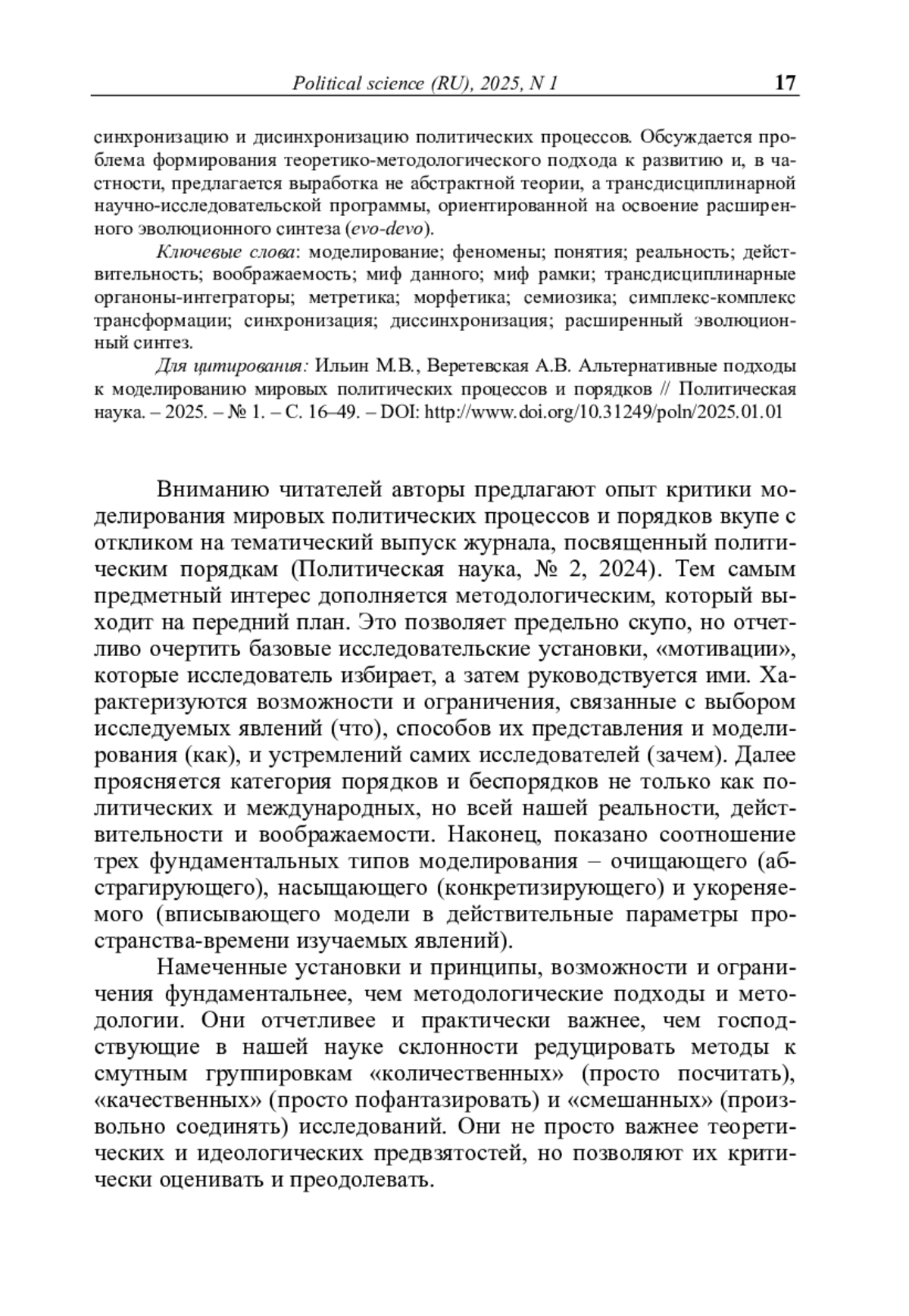 В статье представлены основания и принципы моделирования на примере разбора публикаций спецвыпуска журнала «Политическая наука», посвященного меняющимся мировым порядкам (№ 2, 2024). Проводится различение между моделированием в жизни и научных исследованиях. Освещается роль в политическом моделировании исследовательских вопросов, предмета, метода и мотивации исследований. Различаются явления и понятия о них, их опредмечиваине (reification, Verdinglichung), а также реальность, действительность и воображаемость моделируемых феноменов. Особое внимание уделяется просчетам, вызванным неконтролируемым принятием «мифа данного» (the myth of the given) и «мифа рамки» (the myth of the framework). Рассматриваются процессы очищения насыщения и укоренения моделей, связь этих процессов с симплекскомплекс трансформациями и трансдисциплинарными органонами-интеграторами – метретикой, морфетикой и семиозикой. На материале публикаций спецвыпуска по меняющимся мировым порядкам обсуждаются дополнительные возможности моделирования, в частности, построения динамических моделей, учитывающих синхронизацию и дисинхронизацию политических процессов. Обсуждается проблема формирования теоретико-методологического подхода к развитию и, в частности, предлагается выработка не абстрактной теории, а трансдисциплинарной научно-исследовательской программы, ориентированной на освоение расширенного эволюционного синтеза (evo-devo).