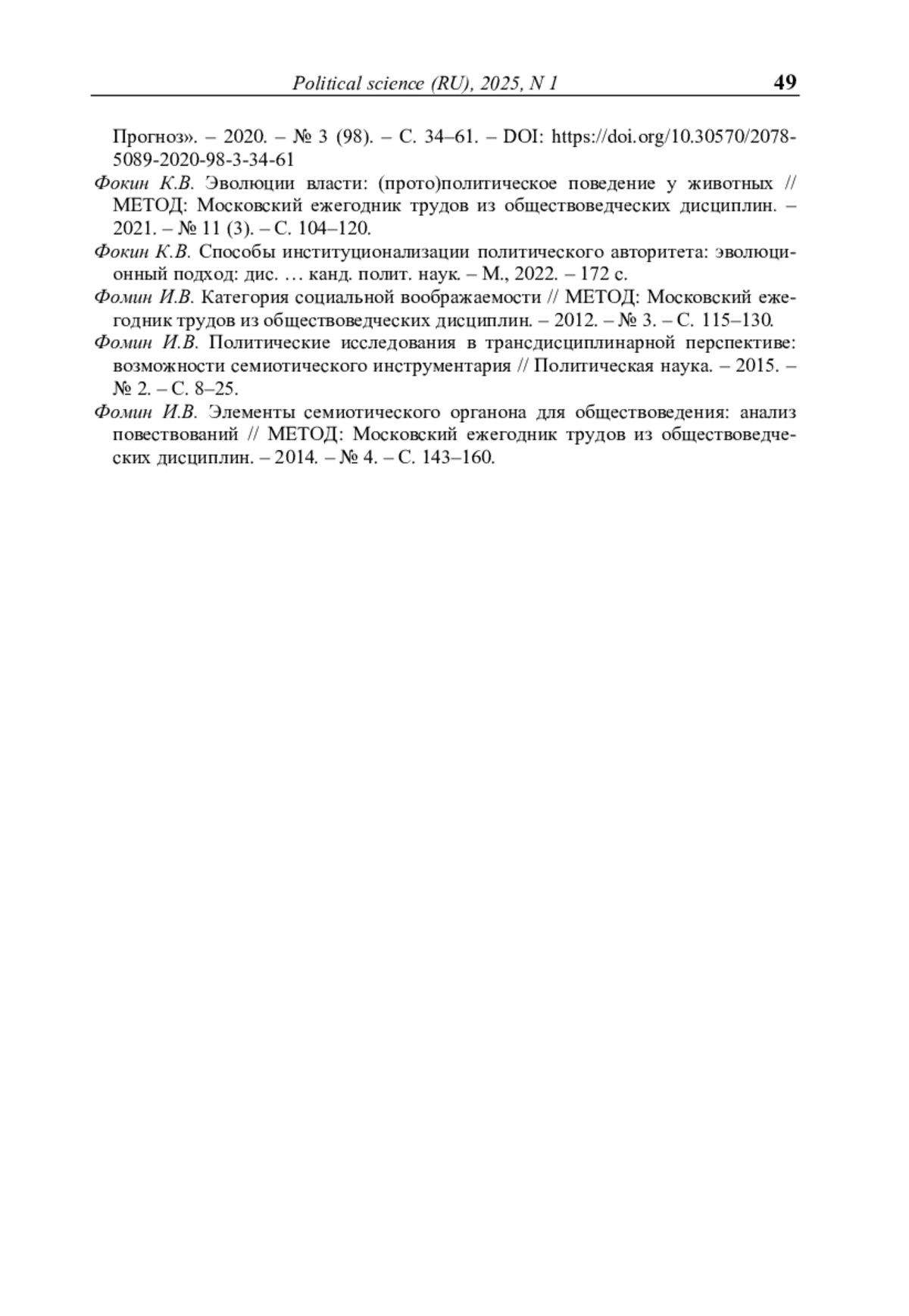 49. Фомин И.В. Политические исследования в трансдисциплинарной перспективе: возможности семиотического инструментария // Политическая наука. - 2015. - № 2. - С. 8-25.