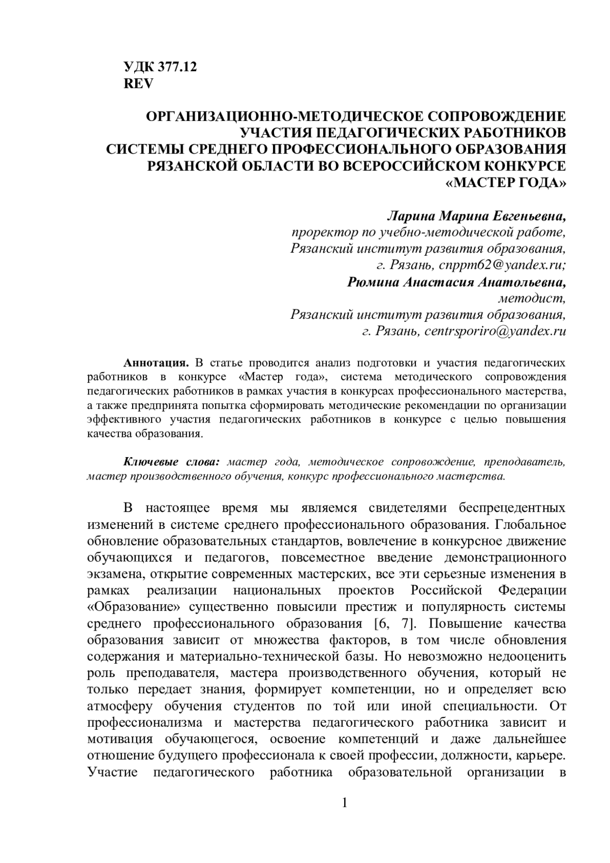 В статье проводится анализ подготовки и участия педагогических работников в конкурсе «Мастер года», система методического сопровождения педагогических работников в рамках участия в конкурсах профессионального мастерства, а также предпринята попытка сформировать методические рекомендации по организации эффективного участия педагогических работников в конкурсе с целью повышения качества образования.