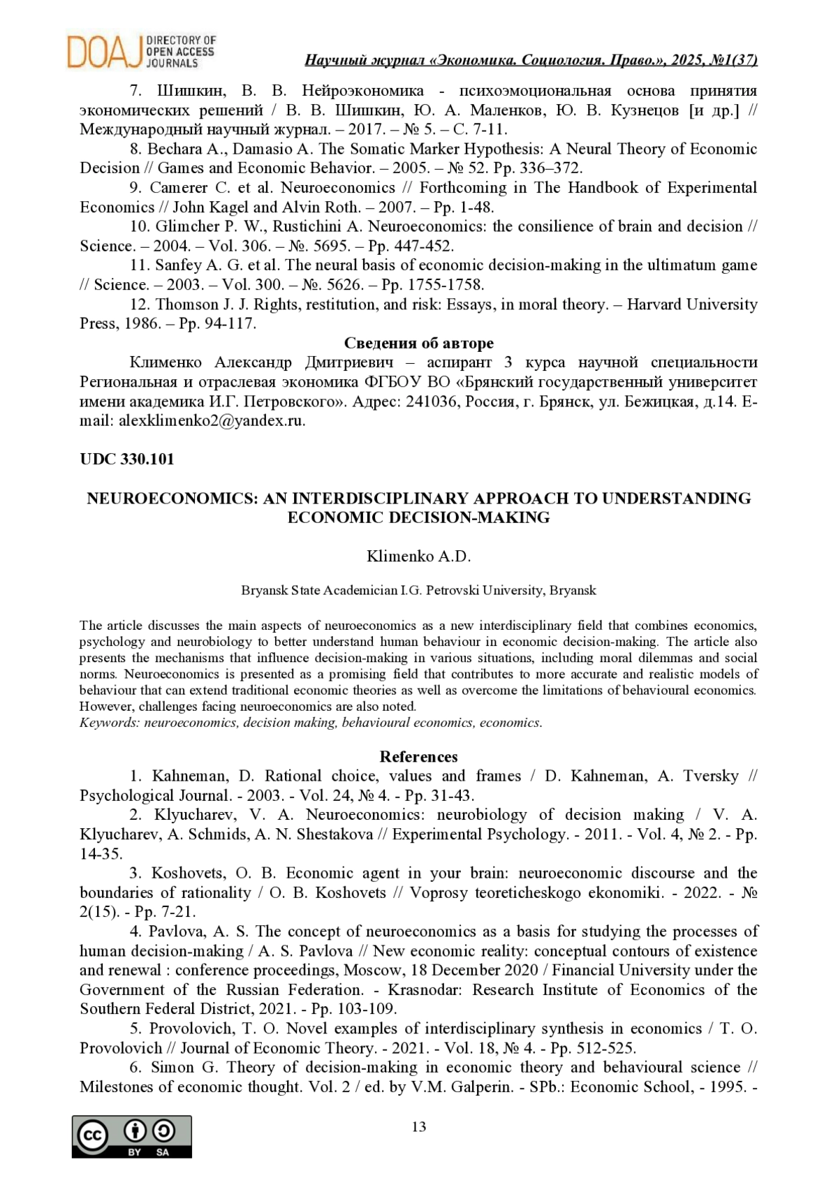 11. Sanfey A. G. et al. The neural basis of economic decision-making in the ultimatum game // Science. - 2003. - Vol. 300. - №. 5626. - Pp. 1755-1758. EDN: GPDPWD