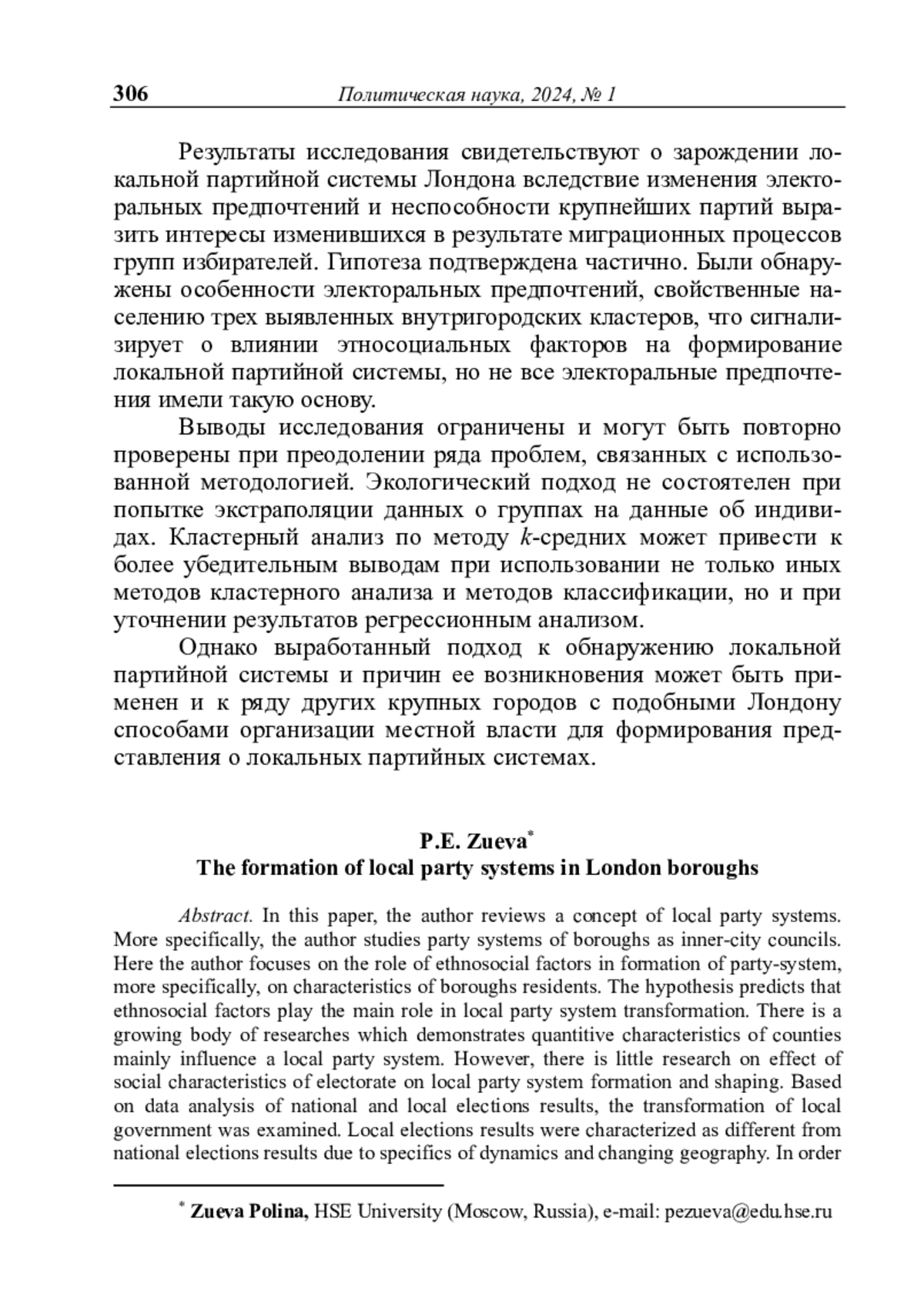 В статье рассмотрен феномен возникновения локальных партийных систем в районных советах на примере европейского мегаполиса с внутренним муниципальным делением. Предпринимается попытка поиска причин формирования локальной партийной специфики в малых административно-территориальных единицах, выдвигается предположение о том, что этносоциальные характеристики меняющегося городского населения становятся источником новых электоральных расколов, отражающихся на локальном уровне. Проведен обзор концепций, подходов и теорий, объясняющих возможные причины формирования электоральных предпочтений и партийных размежеваний внутри мегаполиса. Кроме того, перечислены эффекты, ранее подтвержденные эмпирическими исследованиями, связанные с размером и иными характеристиками территориальных единиц, формирующих представительные органы власти. Выявлена недостаточная изученность характеристик населения внутригородских муниципалитетов, этносоциального, религиозного состава. С применением кластерного и электорального анализа удалось отследить ряд формирующих локальную партийную систему эффектов, среди которых специфика выборов второго порядка, голосование «за друзей и соседей», эффект присоединения к большинству. Голосование во внутригородских районах не повторяло динамические изменения общенациональных выборов, могло характеризоваться специфическими предпочтениями, не являлось однородным на территории города. С обращением к экологическому подходу был обнаружен ряд социально-экономических и этнорелигиозных характеристик населения, формирующих специфические электоральные предпочтения. Так, районы с иммигрантским и небелым населением сдвигаются в сторону левых партий, а социально-экономическое благополучие районов может становиться основой для голосования за локальных акторов, концентрирующих внимание на местной повестке. Обнаружено зарождение локальной партийной системы в Лондоне, в первую очередь связанное с разочарованием избирателей в основных партиях, их неспособностью адаптироваться к новым расколам, возникающим в больших городах с высоким уровнем поляризации населения.