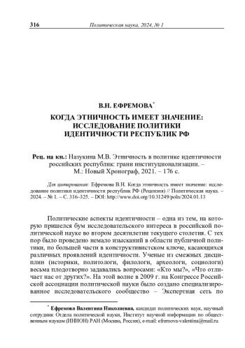 Рецензия на книгу Назукина М. В. Этничность в политике идентичности российских республик: грани институционализации. – М.: Новый Хронограф, 2021. – 176 с.