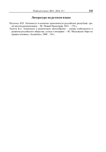 1. Назукина М.В. Этничность в политике идентичности российских республик: грани институционализации. - М.: Новый Хронограф, 2021. - 176 с.