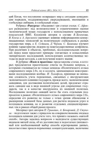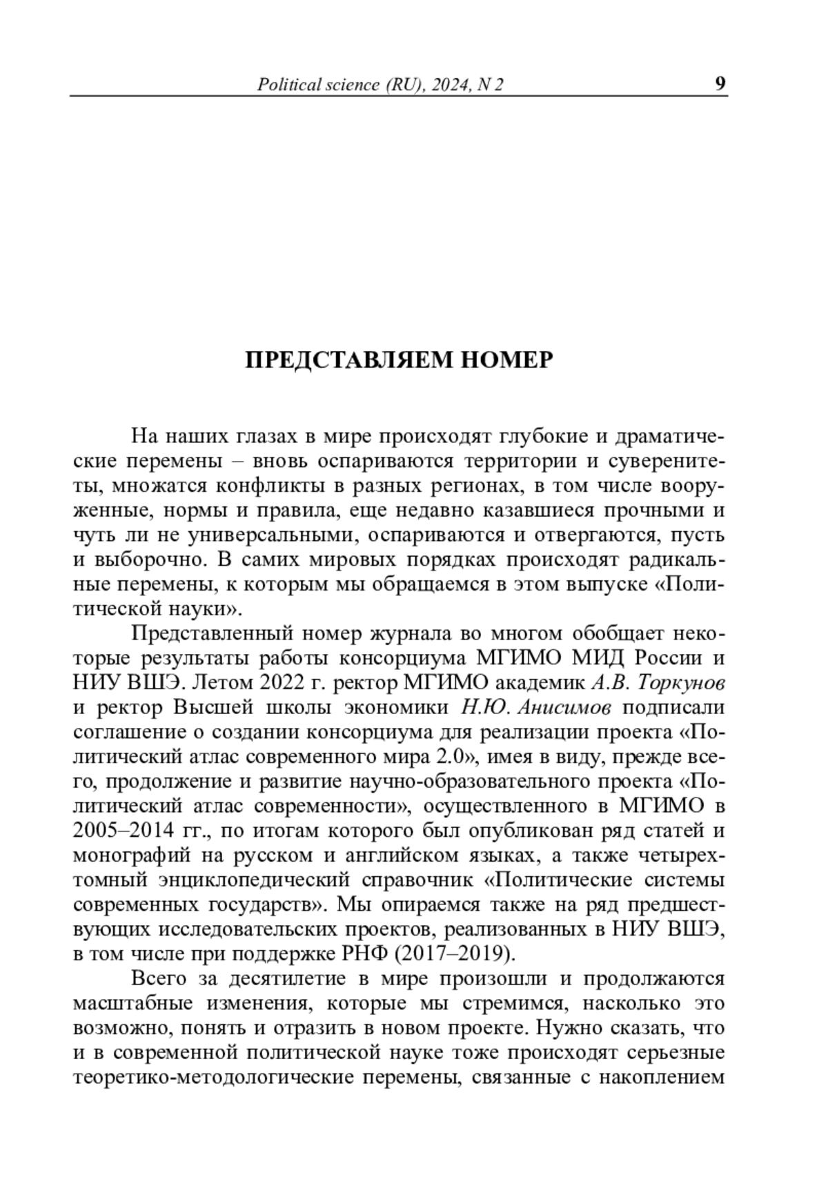 В проекте «Политический атлас современного мира 2.0» присутствуют три основных направления: исследовательское, образовательное и экспертное. В этом номере «Политической науки» отражены в том числе некоторые результаты наших совместных разработок по первому и отчасти второму направлениям. Разумеется, в номер включены и иные важные материалы, выполненные в рамках других научно-исследовательских проектов.