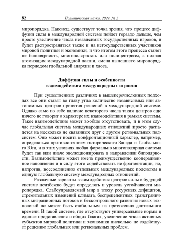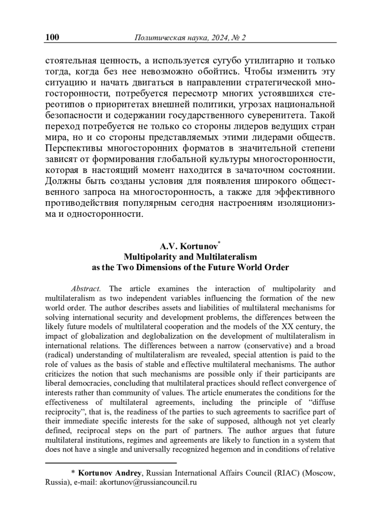 В статье рассматривается взаимодействие многополярности и многосторонности как двух независимых переменных, воздействующих на формирование нового мирового порядка. Автор рассматривает преимущества и недостатки многосторонних механизмов решения проблем безопасности и развития в условиях продолжающейся диффузии силы и влияния в международной системе, отличия будущих моделей многостороннего сотрудничества от моделей ХХ в., влияние процессов глобализации на развитие практики многосторонности в международных отношениях. Выявляются различия между узким (консервативным) и широким (радикальным) пониманием многосторонности, особое внимание уделяется вопросу о роли ценностей как предполагаемой основы стабильных и эффективных многосторонних механизмов. Автор, подвергая критике представления о том, что такие механизмы возможны лишь при условии, что их участниками являются либеральные демократии, приходит к выводу, что многосторонние практики должны быть основаны на совпадении интересов, а не на общности ценностей. В статье перечисляются условия эффективности многосторонних договоренностей, включая принцип «диффузной взаимности», то есть готовности участников таких договоренностей жертвовать частью своих ближайших конкретных интересов во имя предполагаемых, хотя еще и четко не обозначенных встречных шагов со стороны партнеров. Автор обращает внимание на то, что будущие многосторонние институты, режимы и договоренности будут выстраиваться в системе, не имеющей общепризнанного гегемона, и в условиях относительной слабости международных организаций и международного права. Автор приходит к выводу, что в обозримой перспективе наиболее продуктивными и наименее затратными окажутся форматы «проектной многосторонности», основанной на создании подвижных ситуативных коалиций государств и негосударственных участников международных отношений для решения конкретных задач глобального и регионального управления. Накопление позитивных практик «проектной многосторонности» позволит постепенно перейти к более продвинутым практикам «стратегической многосторонности».