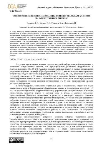 В эпоху широкого распространения цифровизации особое значение приобретают телеграмм-каналы в свете воздействия на общественное мнение, о чем и говорится в данной статье. Актуальность социологического исследования, целью которого является выявление мнения респондентов о степени воздействия социальных сетей на реципиента, не вызывает сомнений. В эпоху широкого распространения цифровизации Интернет становится основным источником информации для множества пользователей, поэтому важно понять, отрицательным или положительным является влияние социальных сетей на людей. При обнаружении негативных последствий нужно разрабатывать меры по устранению рисков, которые несет с собой повсеместное распространение информатизации. Авторы провели социологическое исследование с целью рассмотреть проблемы, связанные с влиянием телеграмм-каналов на пользователей сети Интернет. В статье показано, почему привлекательно именно данное средство распространения информации, а также продемонстрировано, что телеграмм-каналы - способ манипулирования общественным мнением.
