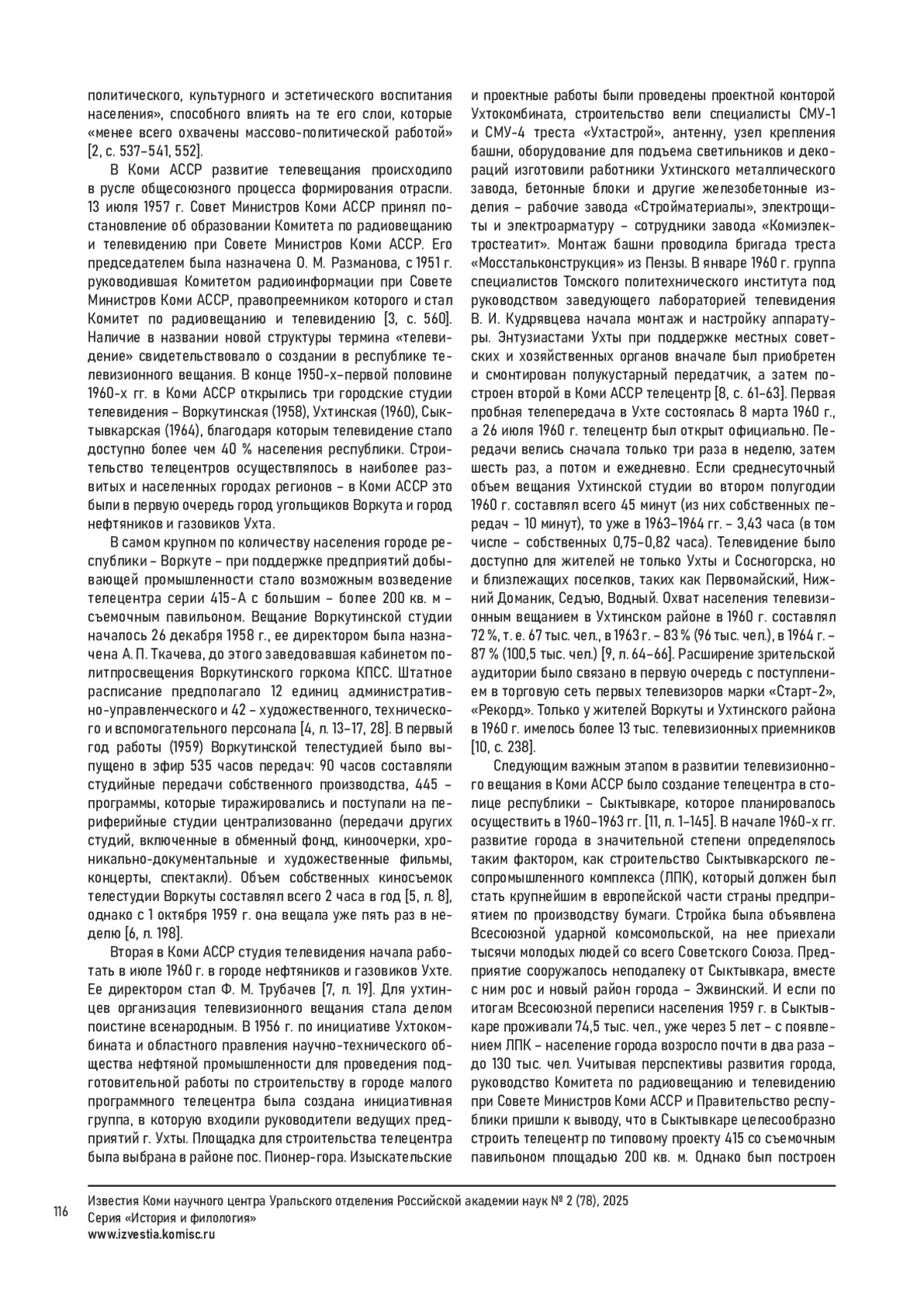 В Коми АССР развитие телевещания происходило в русле общесоюзного процесса формирования отрасли. 13 июля 1957 г. Совет Министров Коми АССР принял постановление об образовании Комитета по радиовещанию и телевидению при Совете Министров Коми АССР. Его председателем была назначена О. М. Разманова, с 1951 г. руководившая Комитетом радиоинформации при Совете Министров Коми АССР, правопреемником которого и стал Комитет по радиовещанию и телевидению [3, с. 560]. Наличие в названии новой структуры термина «телевидение» свидетельствовало о создании в республике телевизионного вещания. В конце 1950-х–первой половине 1960-х гг. в Коми АССР открылись три городские студии телевидения – Воркутинская (1958), Ухтинская (1960), Сыктывкарская (1964), благодаря которым телевидение стало доступно более чем 40 % населения республики. Строительство телецентров осуществлялось в наиболее развитых и населенных городах регионов – в Коми АССР это были в первую очередь город угольщиков Воркута и город нефтяников и газовиков Ухта.