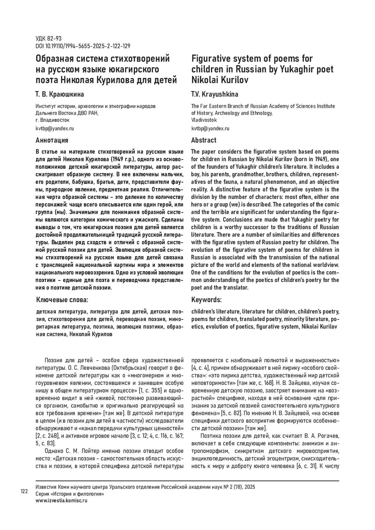 Л. В. Калашникова и Д. А. Любимова, изучив переводы детских английских стихов на русский язык, акцентируют внимание на особенностях образной системы и ее воздействии: «Детские стихи создаются для детского восприятия, они должны быть короткими, содержать яркие объемные образы, включающие фантазию, множество забавных персонажей, диалогов, нести положительные эмоции и порождать интерес» [8, с. 235]. К схожим выводам приходит и И. А. Кажарова, проанализировавшая детскую поэзию Ю. Пхитикова: «…в ряду определяющих черт детской поэзии <…> оказываются диалогичность, сюжетность, умелое использование звуковой инструментовки и графики» [9, с. 37]. Не остались без внимания и образы поэзии для детей. Так, например, исследователи рассматривают образы девочки, мамы, отца, бабушки, детей в стихотворениях А. Л. Барто и Е. А. Благининой [10, 11], особо выделяют образ шалуна [12, 13], возникший во второй половине ХХ в. В этом ключе интересным представляется опыт взаимодействия русской литературы с миноритарной литературой (в частности, с юкагирской поэзией для детей), которая является самостоятельной ветвью поэтики русскоязычной литературы.