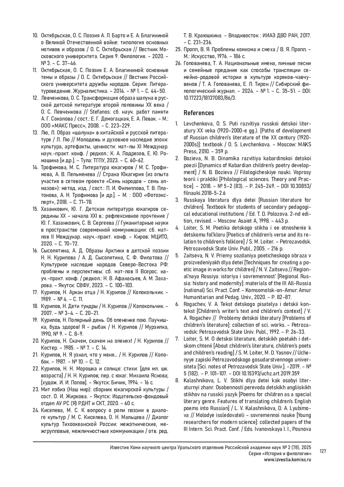 16. Сысолятина, А. Д. Образы Арктики в детской поэзии Н. Н. Курилова / А. Д. Сысолятина, С. Ф. Филатова // Культурное наследие народов Северо-Востока РФ: проблемы и перспективы: сб. мат-лов II Всерос. науч.-практ. конф. / редкол.: Н. В. Афанасьев, А. М. Захарова. - Якутск: СВФУ, 2023. - С. 100-103.