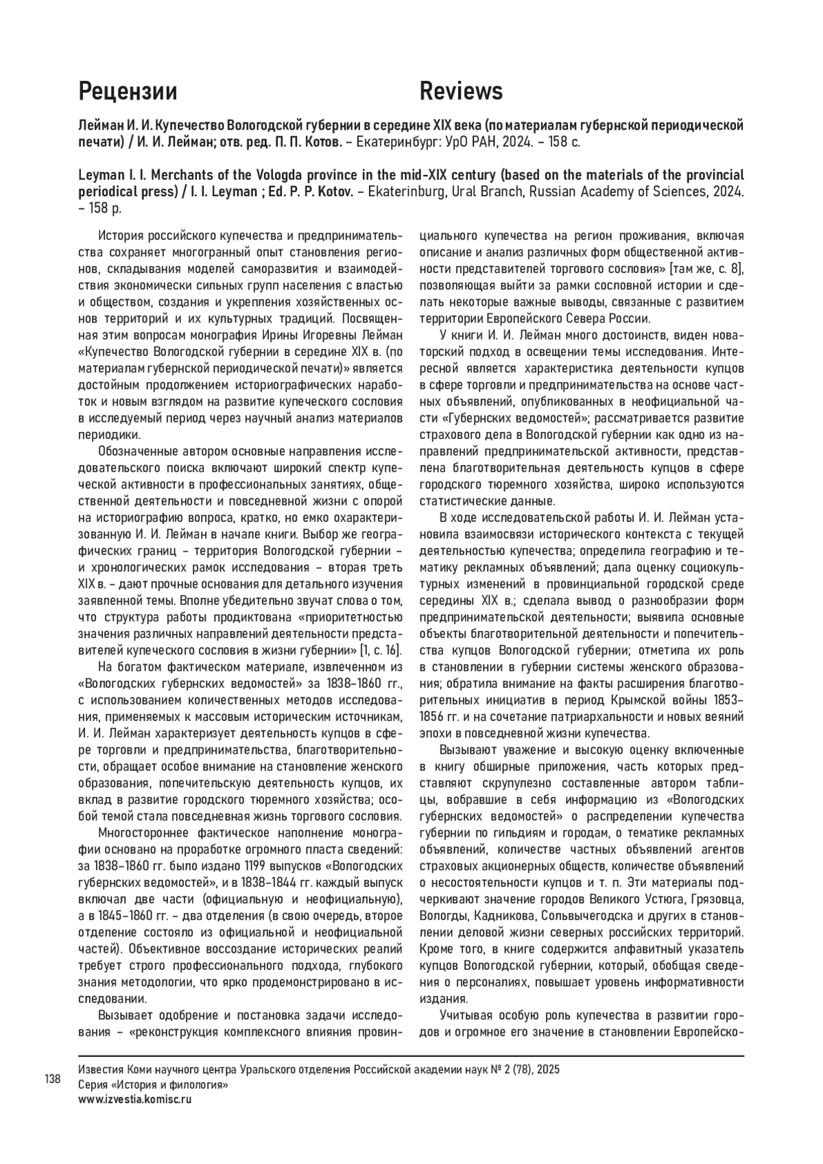 1. Лейман, И. И. Купечество Вологодской губернии в середине XIX века (по материалам губернской периодической печати) / И. И. Лейман; отв. ред. П. П. Котов. - Екатеринбург: УрО РАН, 2024. - 158 с.