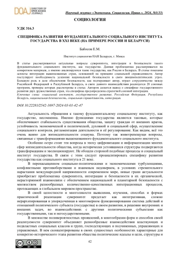 В статье рассматриваются актуальные вопросы суверенитета, интеграции и безопасности такого фундаментального социального института, как государство. Данная проблематика рассматривается на конкретном материале, а именно анализируются такие государства, как Россия и Беларусь. В статье показаны аспекты интеграции вышеназванных стран, основанной на принципе социальной справедливости. Автор постулирует необходимость усиления национальной безопасности в свете внешнеполитических угроз. Большую роль в деле обеспечения безопасности, как подчеркивает автор, играет сотрудничество между Российской Федерацией и Республикой Беларусь, в свете данного взаимодействия реализуется 28 союзных программ, примеры которых рассмотрены в статье. Автором делается вывод о специфике государственного развития двух дружественных стран, эта специфика предопределена стратегией союзной интеграции.