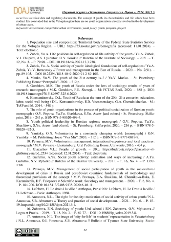 20. Дорошенко, С.В. “Молодежный фактор” социально-экономического развития Российского мегаполиса / С.В. Дорошенко, Я.И. Соломатин // Региональная экономика и управление: электронный научный журнал. - 2015. - № 1(41). - С. 13-30. EDN: TNDZJF