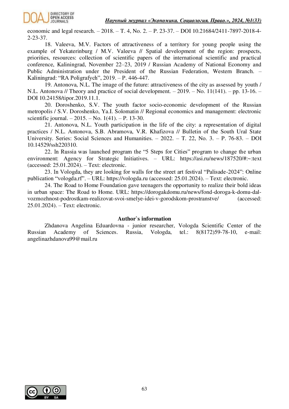 18. Валеева, М.В. Факторы привлекательности территории для молодежи на примере г. Екатеринбурга / М.В. Валеева // Пространственное развитие региона: перспективы, приоритеты, ресурсы: сборник научных трудов международной научно-практической конференции, Калининград, 22-23 ноября 2019 года / Российская академия народного хозяйства и государственной службы при Президенте Российской Федерации, Западный филиал. - Калининград: “РА Полиграфычъ”, 2019. - С. 446-447. EDN: JXGMKC