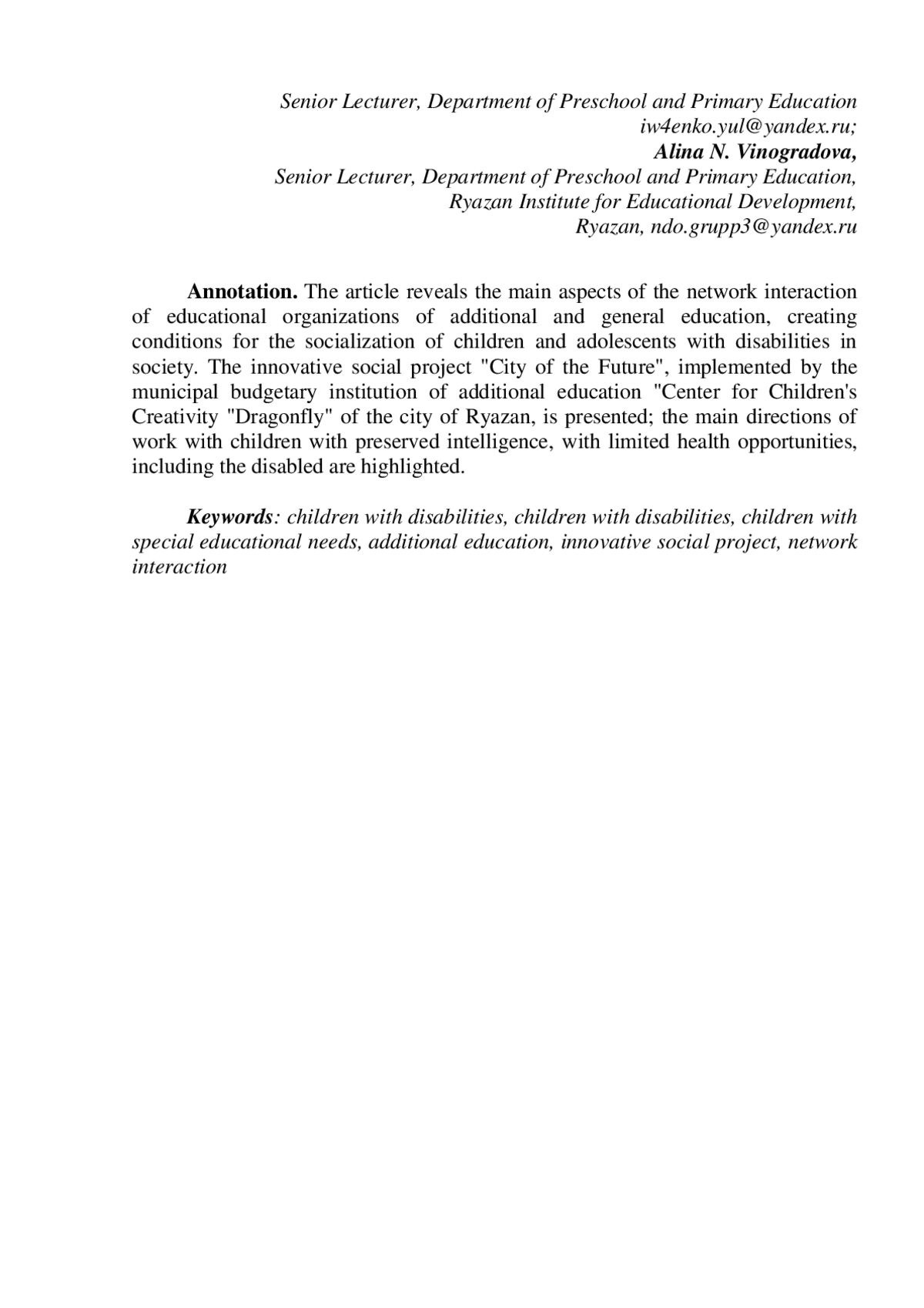 В статье раскрываются основные аспекты сетевого взаимодействия образовательных организаций дополнительного и общего образования, создающих условия для социализации детей и подростков с ограниченными возможностями здоровья в обществе. Представлен инновационный социальный проект «Город будущего», реализуемый муниципальным бюджетным учреждением дополнительного образования «Центр детского творчества «Стрекоза» города Рязани; выделены основные направления работы с детьми с сохранным интеллектом, имеющими ограниченные возможности здоровья, в том числе инвалидами.