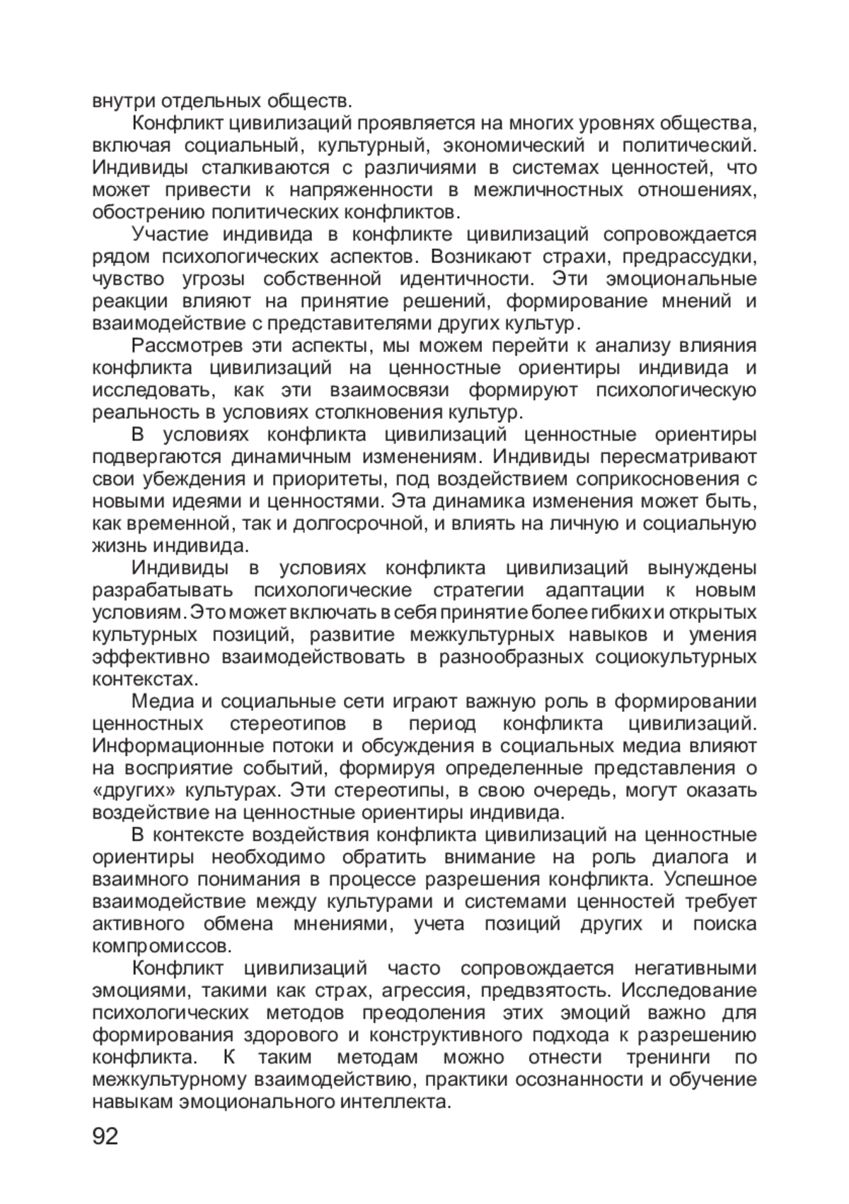 В современном мире мы сталкиваемся с рядом сложных вызовов, в том числе и с конфликтом цивилизаций – феноменом, оказывающим 91 глубокое воздействие на психологический мир населения втянутых в конфликт государств. Геополитическое противостояние между ведущими странами и целыми военно-политическими блоками государств проявляется в самых различных сферах: политической, военной, экономической, информационной, социальной и других.
