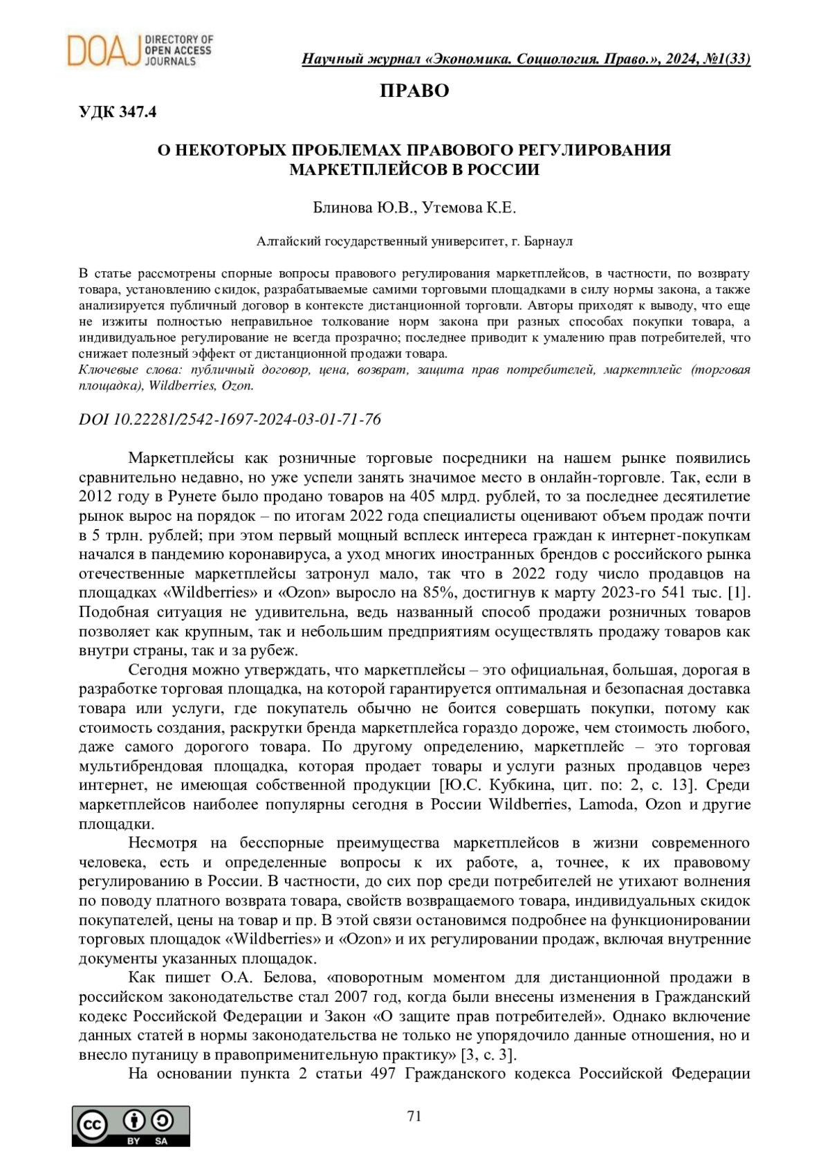 В статье рассмотрены спорные вопросы правового регулирования маркетплейсов, в частности, по возврату товара, установлению скидок, разрабатываемые самими торговыми площадками в силу нормы закона, а также анализируется публичный договор в контексте дистанционной торговли. Авторы приходят к выводу, что еще не изжиты полностью неправильное толкование норм закона при разных способах покупки товара, а индивидуальное регулирование не всегда прозрачно; последнее приводит к умалению прав потребителей, что снижает полезный эффект от дистанционной продажи товара.
