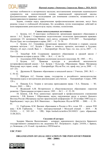 Статья рассматривает организацию правового воспитания в постсоветский период, в период с 90-х по 00-ые годы. Падение социалистической системы и возникновение новых государств привели к изменениям в образовательной сфере, в том числе и в сфере правового воспитания. Статья анализирует ключевые изменения и вызовы, с которыми столкнулись образовательные учреждения в этот период. В результате проведенного исследования были выявлены основные тенденции организации правового воспитания, такие как пересмотр учебных планов и программ, интеграция международных стандартов прав человека в национальные образовательные программы, а также активное внедрение интерактивных методик обучения. Анализируется важность укрепления взаимодействия между образовательными учреждениями, государственными органами и обществом для создания наилучших условий для правового воспитания. Кроме того, статья обсуждает изменения в содержании образования: от формирования новых учебных планов до внедрения передовых методик обучения и новых подходов к оценке результатов образования. Важной частью статьи является также обсуждение значимости развития гражданского общества и формирования уважения к правам и свободам человека через систему образования в постсоветском контексте. В целом, статья представляет собой обзор ключевых изменений и вызовов, с которыми столкнулось правовое воспитание в постсоветский период, и обсуждает важность этих процессов для развития общества в целом.