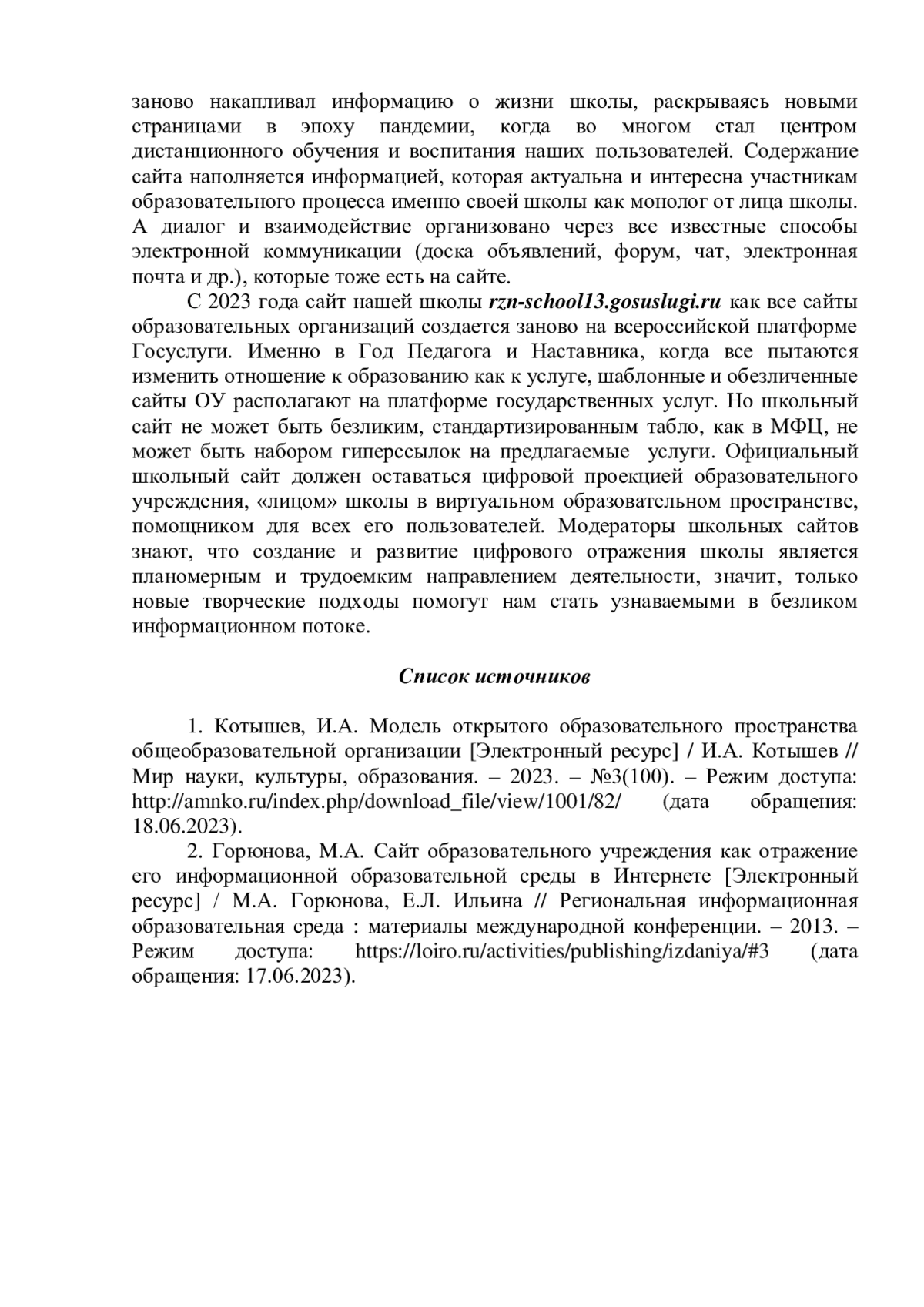 2. Горюнова, М.А. Сайт образовательного учреждения как отражение его информационной образовательной среды в Интернете [Электронный ресурс] / М.А. Горюнова, Е.Л. Ильина // Региональная информационная образовательная среда: материалы международной конференции. - 2013. -Режим доступа: https://loiro.ru/activities/publishing/izdaniya/#3 (дата обращения: 17.06.2023).
