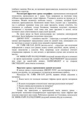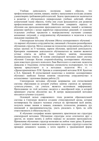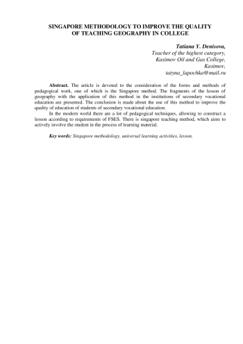 Статья посвящена рассмотрению форм и методов педагогической работы, одним из которых является сингапурская методика. Представлен фрагмент урока по географии с применением данной методики в учреждениях среднего профессионального образования. Сделан вывод об использования данной методики для повышения качества образования студентов среднего профессионального образования. В современном мире существует огромное количество педагогических методик, позволяющих построить урок согласно требованиям ФГОС. Существует сингапурская методика обучения, целью которой является активное включение обучающегося в процесс усвоения учебного материала.