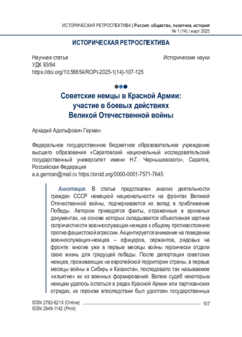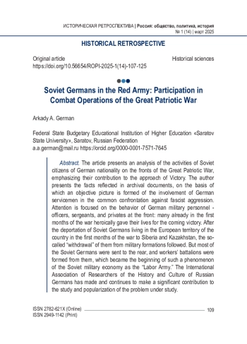 В статье представлен анализ деятельности граждан СССР немецкой национальности на фронтах Великой Отечественной войны, подчеркивается их вклад в приближение Победы. Автором приводятся факты, отраженные в архивных документах, на основе которых складывается объективная картина сопричастности военнослужащих-немцев к общему противостоянию против фашистской агрессии. Акцентируется внимание на поведении военнослужащих-немцев – офицеров, сержантов, рядовых на фронте: многие уже в первые месяцы войны героически отдали свою жизнь для грядущей победы. После депортации советских немцев, проживающих на европейской территории страны, в первые месяцы войны в Сибирь и Казахстан, последовало так называемое «изъятие» их из военных формирований. Волею судеб некоторым немцам удалось остаться в рядах Красной Армии или партизанских отрядах, их героизм впоследствии был удостоен государственных наград. Но большая часть советских немцев была отправлена в тыл, из них формировали рабочие батальоны, ставшие началом такого феномена советской военной экономики как «Трудовая армия».
