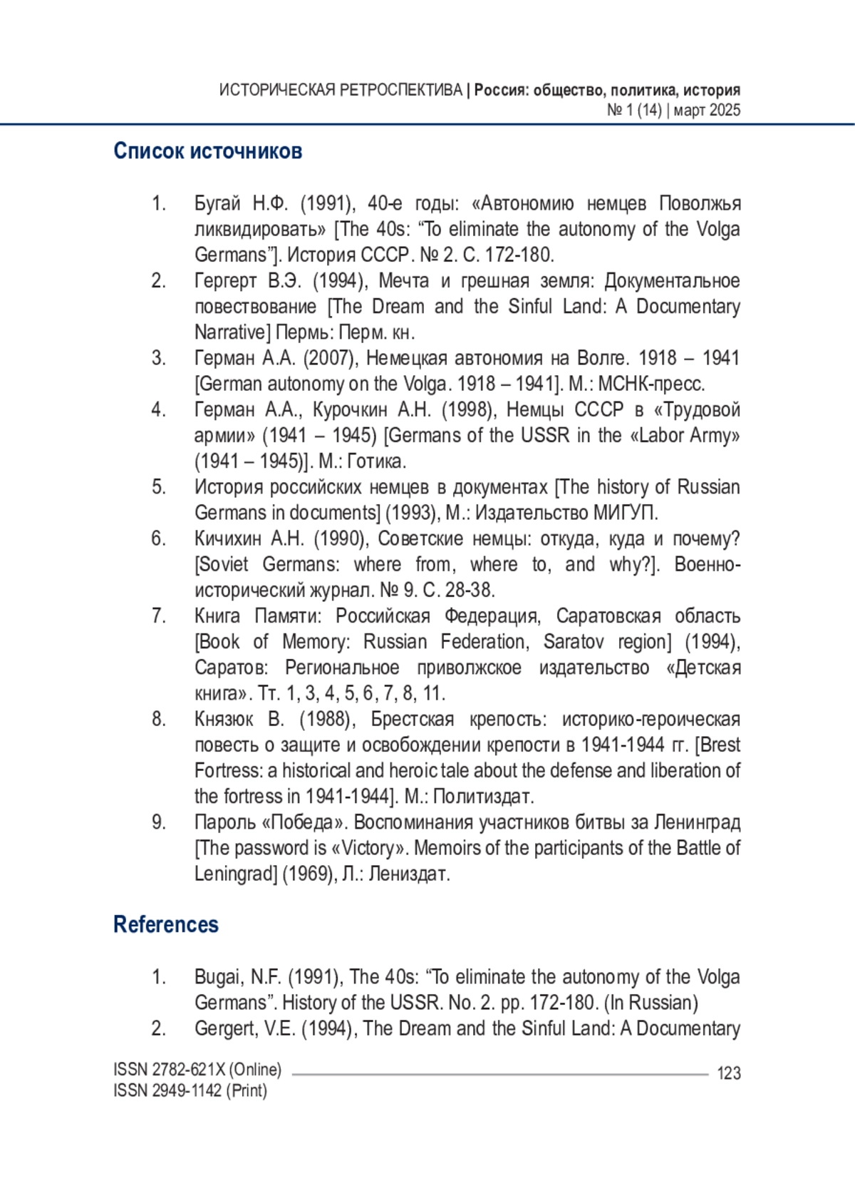1. Бугай Н.Ф. (1991), 40-е годы: «Автономию немцев Поволжья ликвидировать» [The 40s: “To eliminate the autonomy of the Volga Germans”]. История СССР. № 2. С. 172-180.